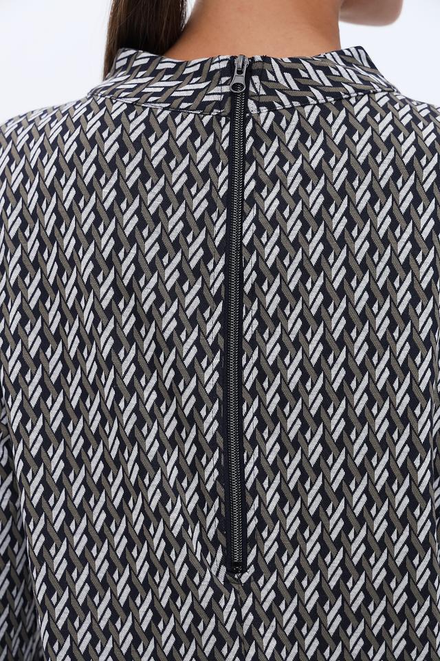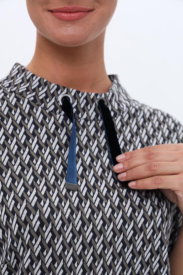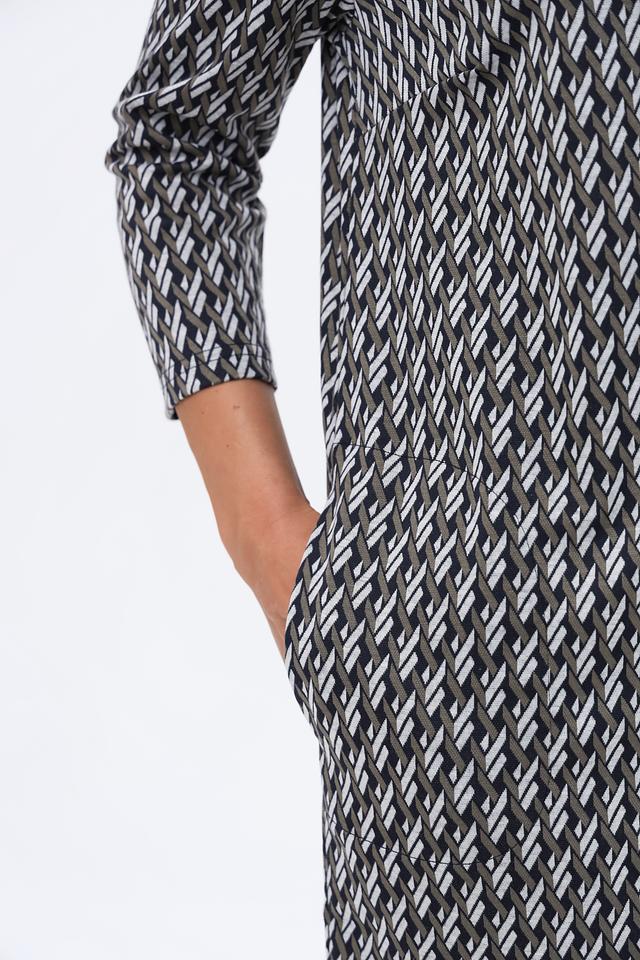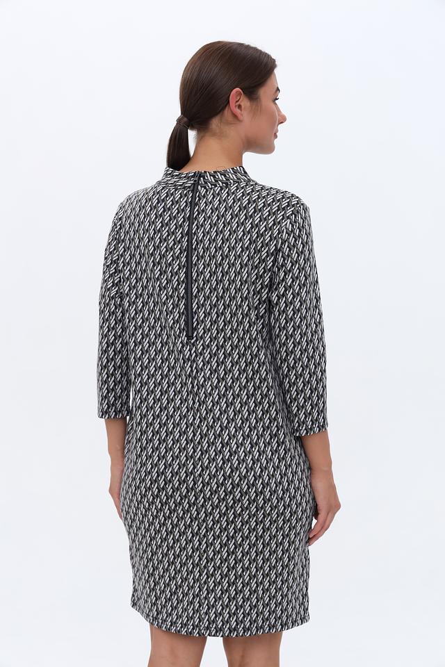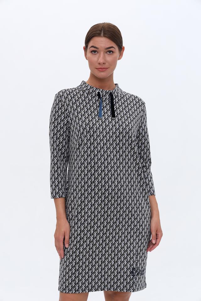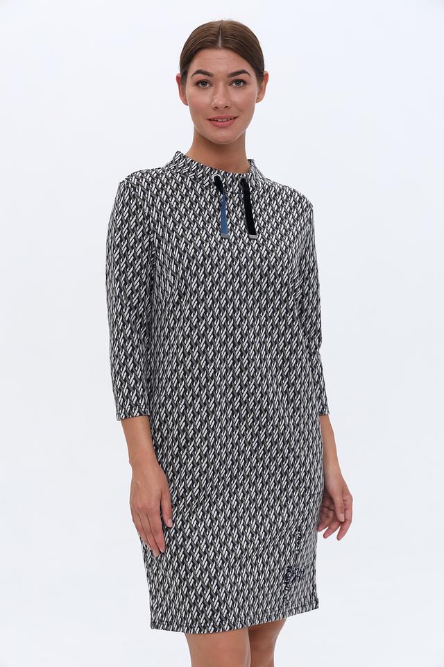 Это платье от Lebek – идеальный выбор для тех, кто ценит комфорт и стиль. Платье выполнено в чёрно-белой цветовой гамме и украшено выразительным геометрическим принтом, который придает ему современный вид.