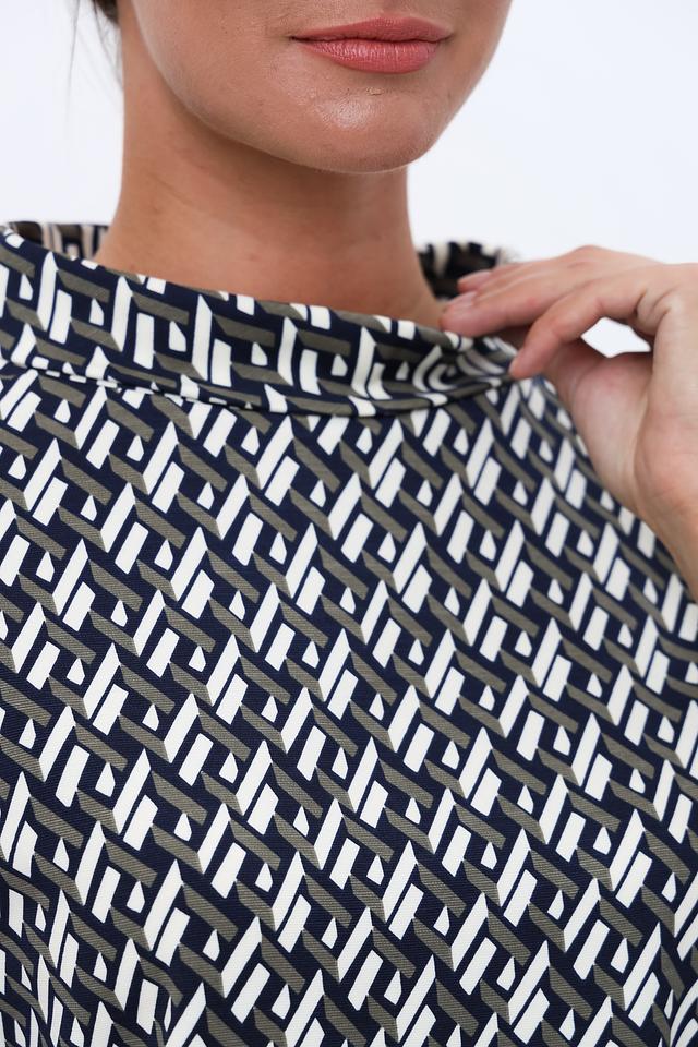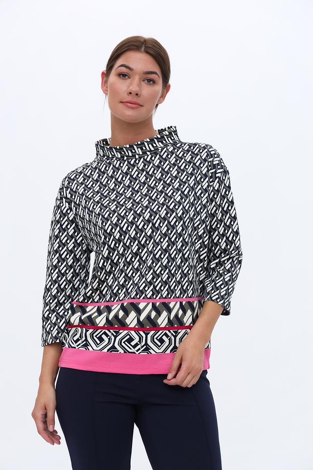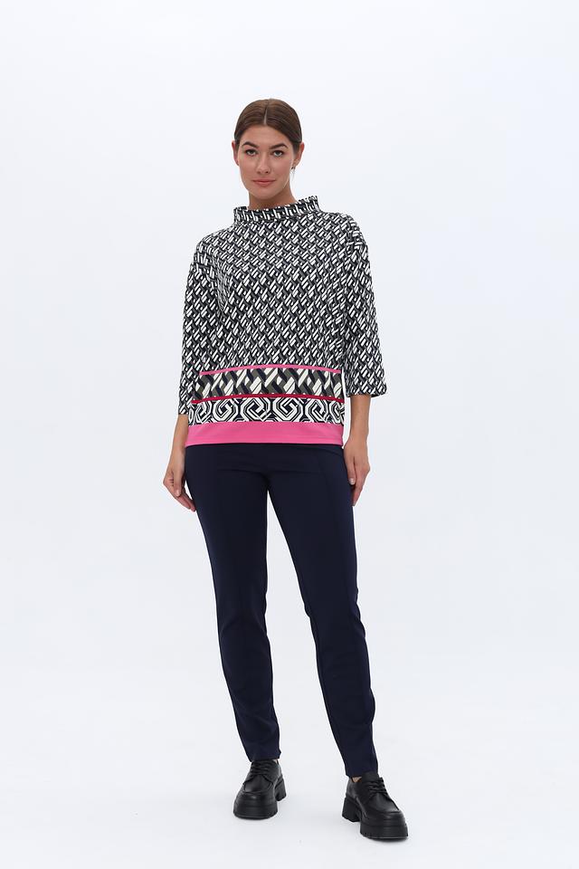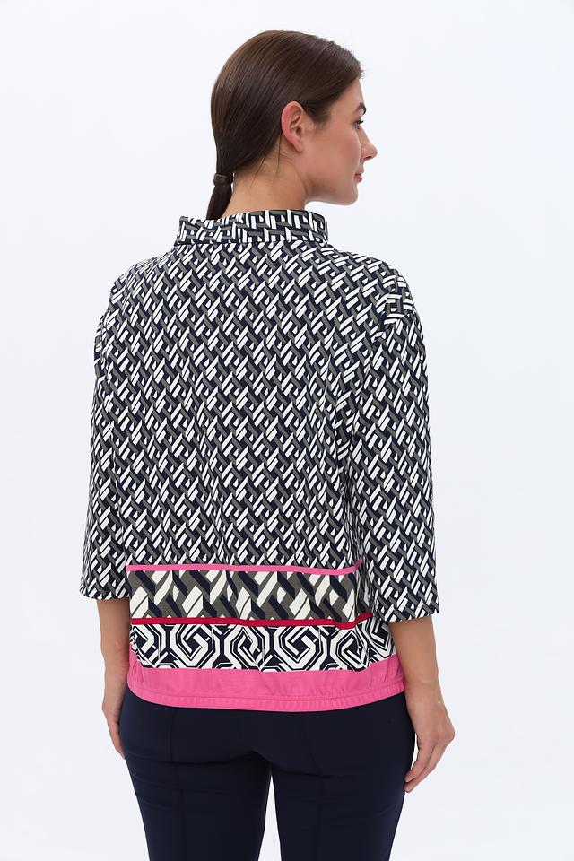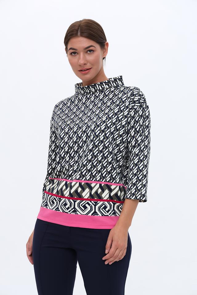 Женский пуловер Barbara Lebek чёрно-белого цвета с ярким геометрическим принтом и розовой вставкой. Модель с короткими рукавами и высоким воротником-стойкой станет стильным дополнением к вашему гардеробу. Состав: полиэстер 95%, эластан 5%
