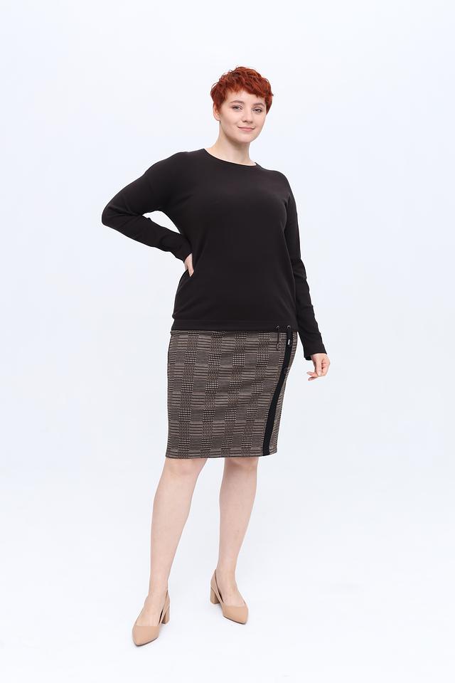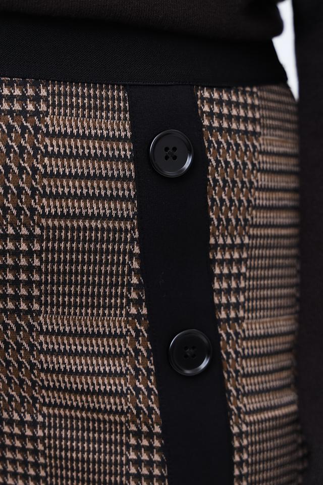 Юбка имеет классический крой-карандаш и длину до колена. Её отличает оригинальный клетчатый принт в коричневых тонах, который придает образу изысканность. Боковая вставка выполнена из однотонной черной ткани, что создает контрастный эффект и визуально стройнит фигуру.
