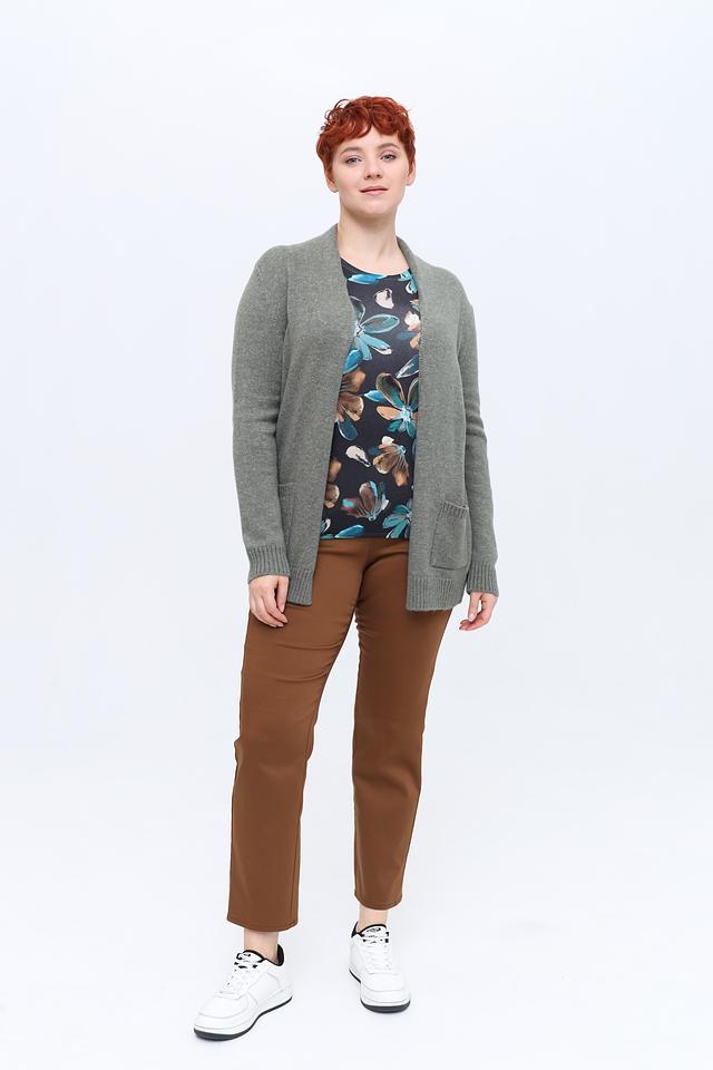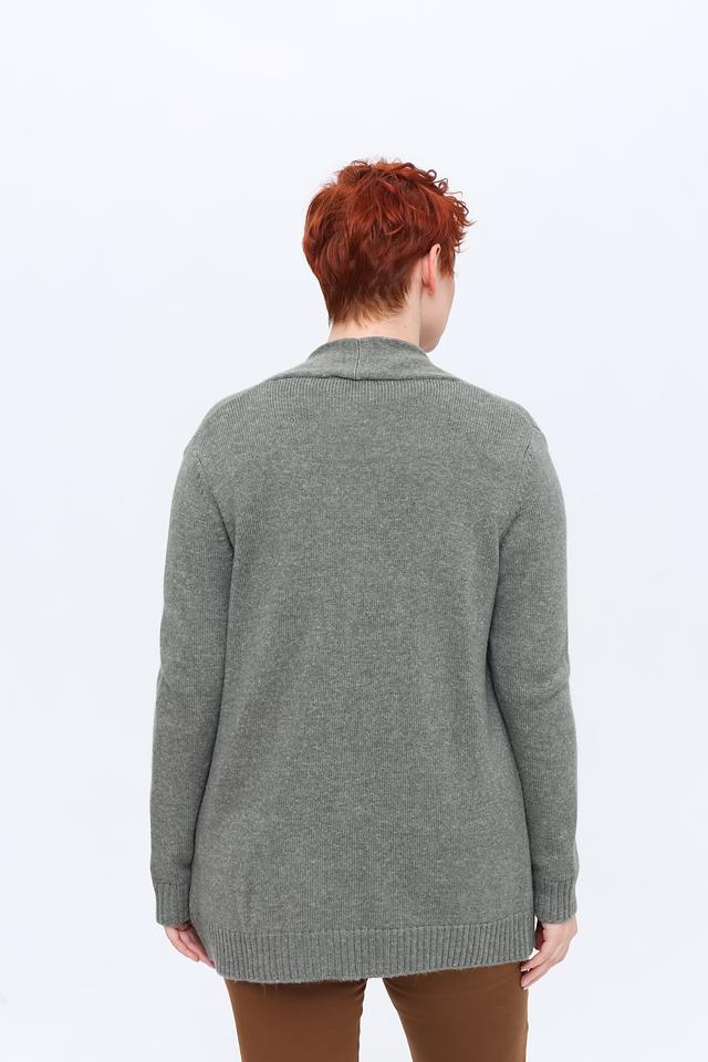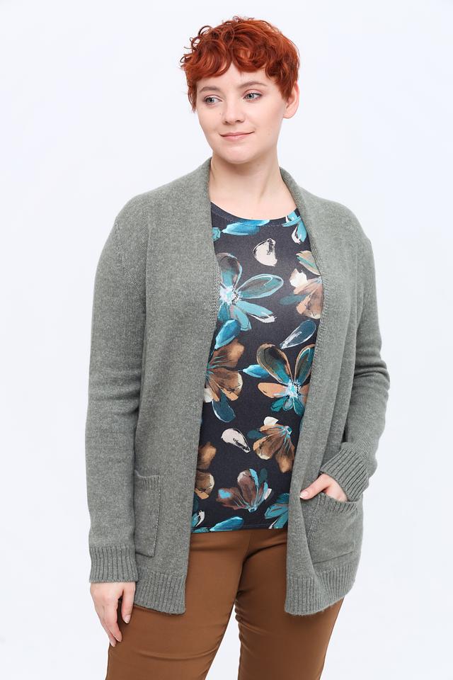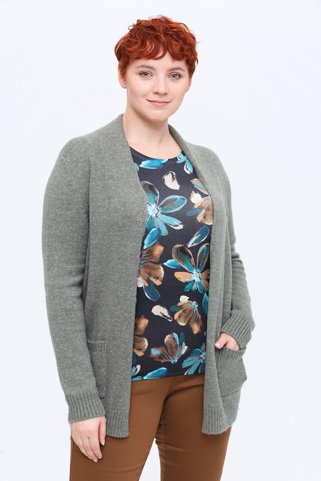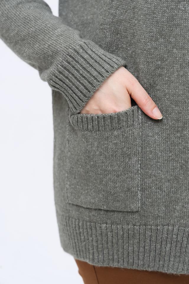 Модель имеет классический силуэт, V-образный вырез и длинные рукава. Два удобных кармана добавляют функциональности. Серый цвет кардигана легко сочетается с различными элементами одежды, позволяя создавать разнообразные образы.