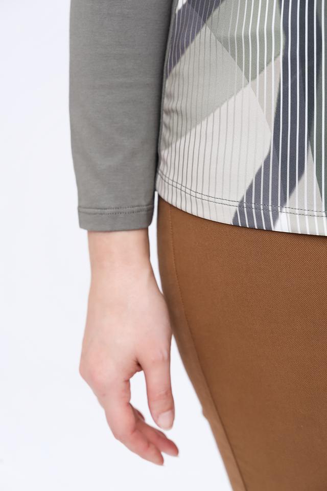 Лонгслив имеет прямой крой и длинные рукава. Основной цвет – серый, а передняя часть украшена ярким геометричным принтом в оттенках серого, розового и белого. Принт выполнен в виде вертикальных полос, создающих визуально вытягивающий эффект.