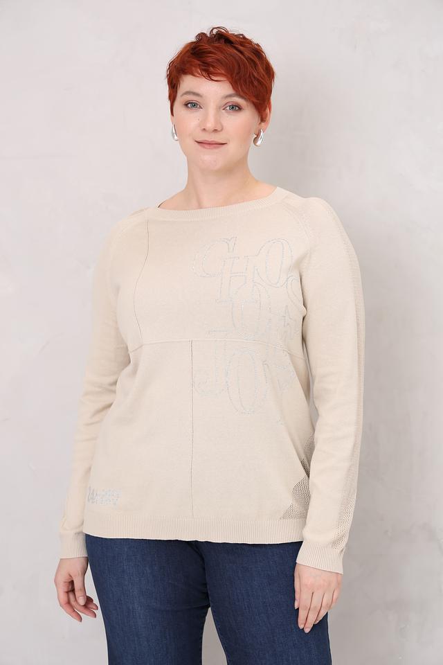 Основной акцент пуловера – это декоративное оформление в виде логотипа, выполненного с использованием блестящих элементов. Это придает изделию изысканность и индивидуальность.