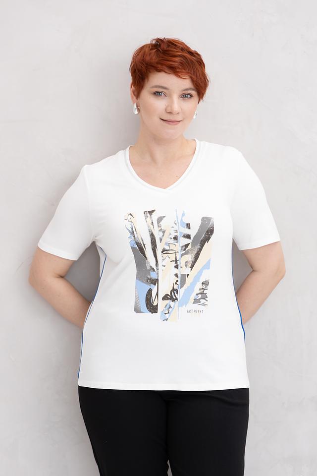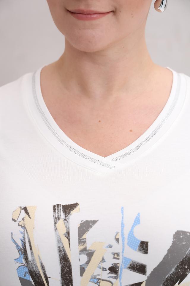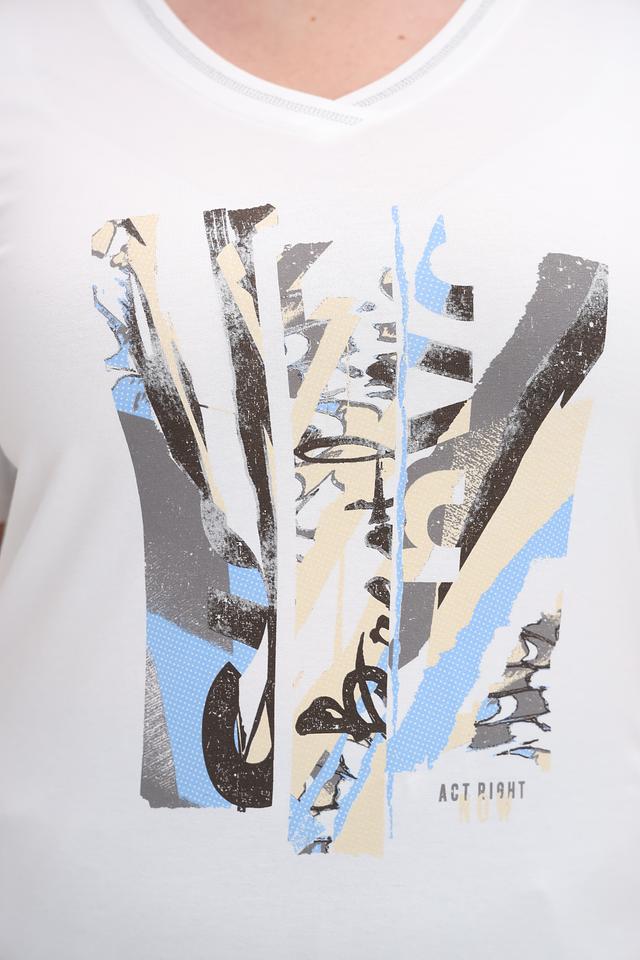 Модель имеет прямой крой, короткие рукава и V-образный вырез горловины. Футболка украшена ярким принтом в графитовой, голубой и бежевой гамме, который добавляет образу оригинальности.