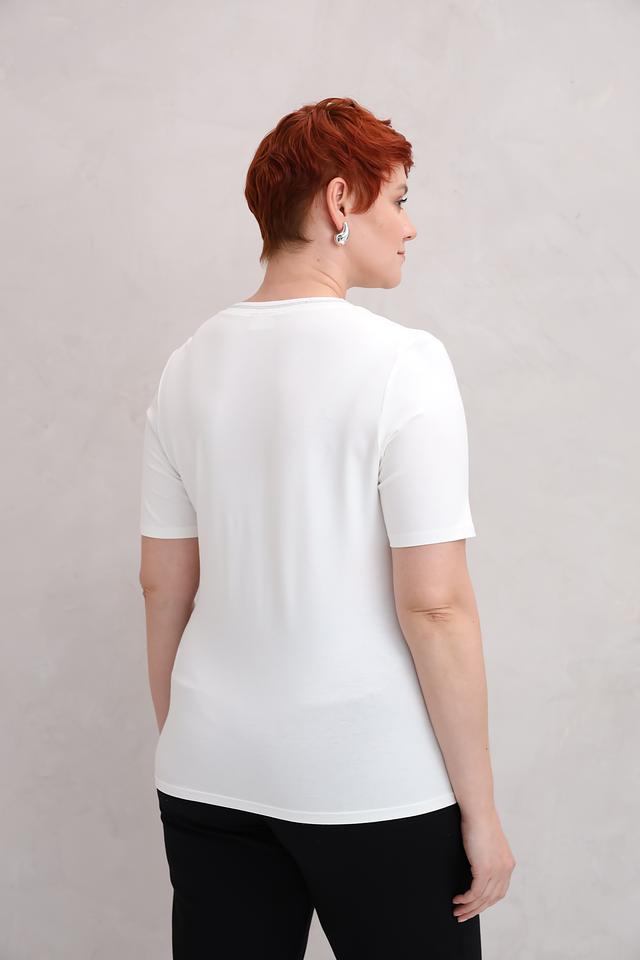 Белая футболка Barbara Lebek с оригинальным принтом и V-образным вырезом. Изготовлена из мягкой вискозы с добавлением эластана для комфорта и хорошей посадки. Идеальный выбор для создания стильного повседневного образа. Состав: вискоза 92%, эластан 8%