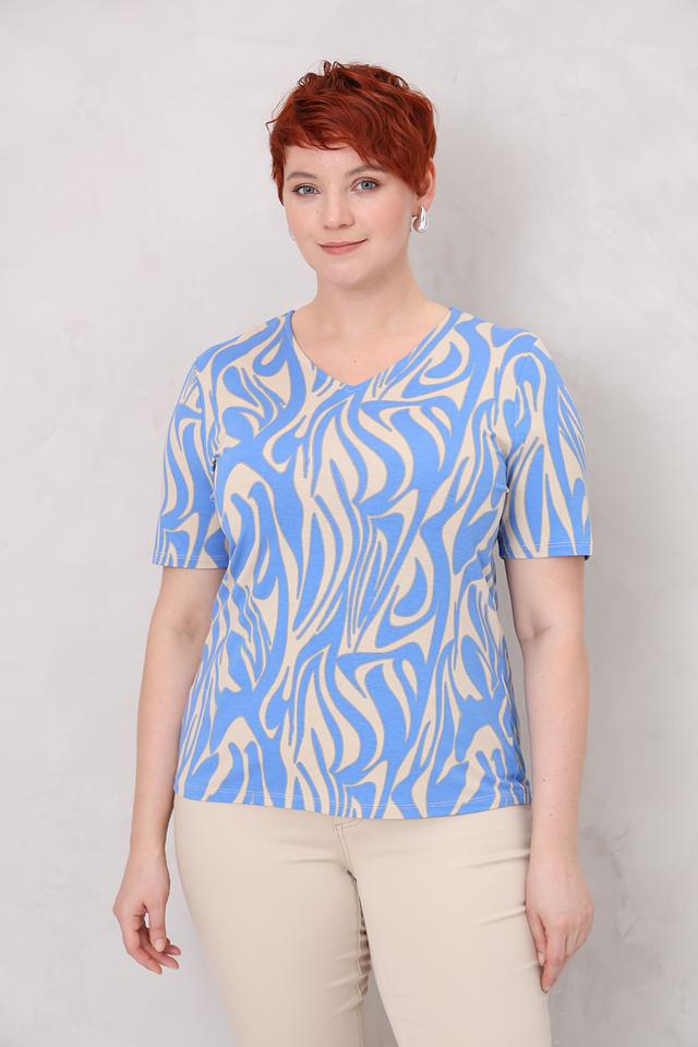 Особенностью данной модели является яркий и необычный принт в голубых и бежевых тонах, который добавит вашему образу индивидуальности и стиля. Футболка идеально сочетается с джинсами, брюками или юбками, позволяя создавать разнообразные образы для повседневной жизни.