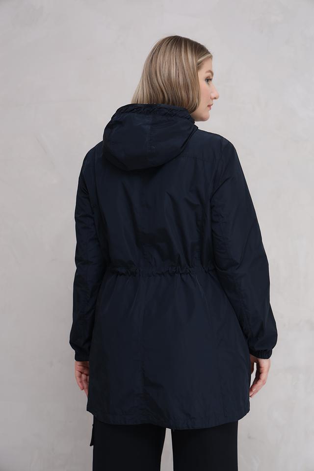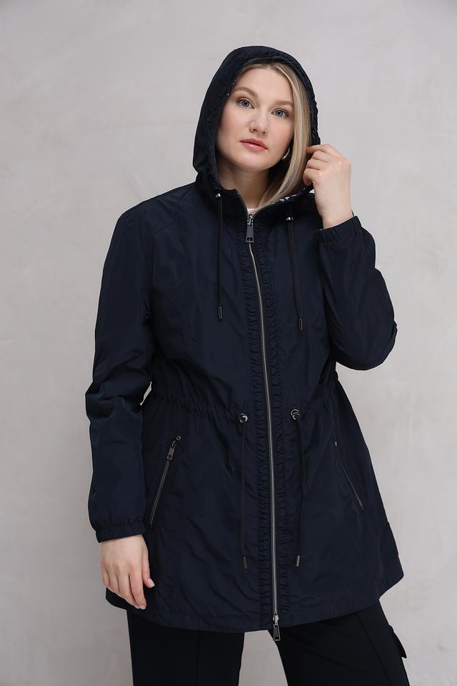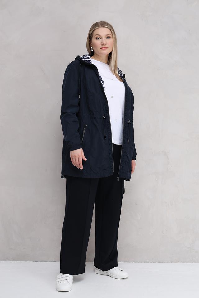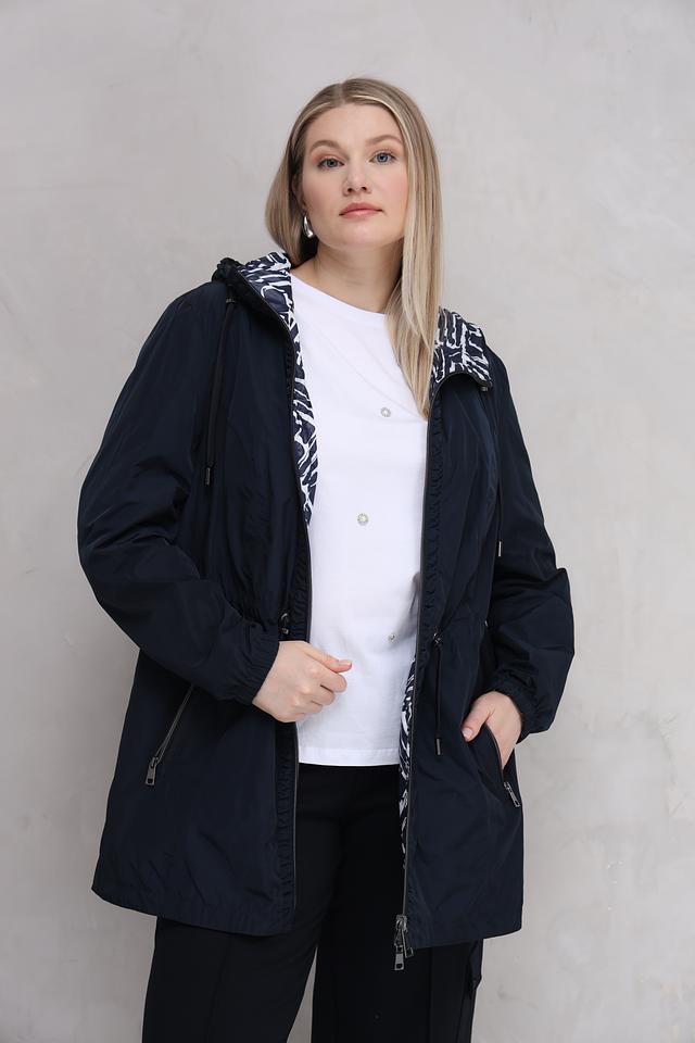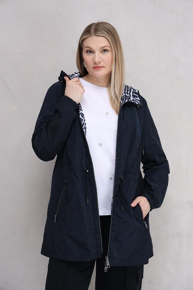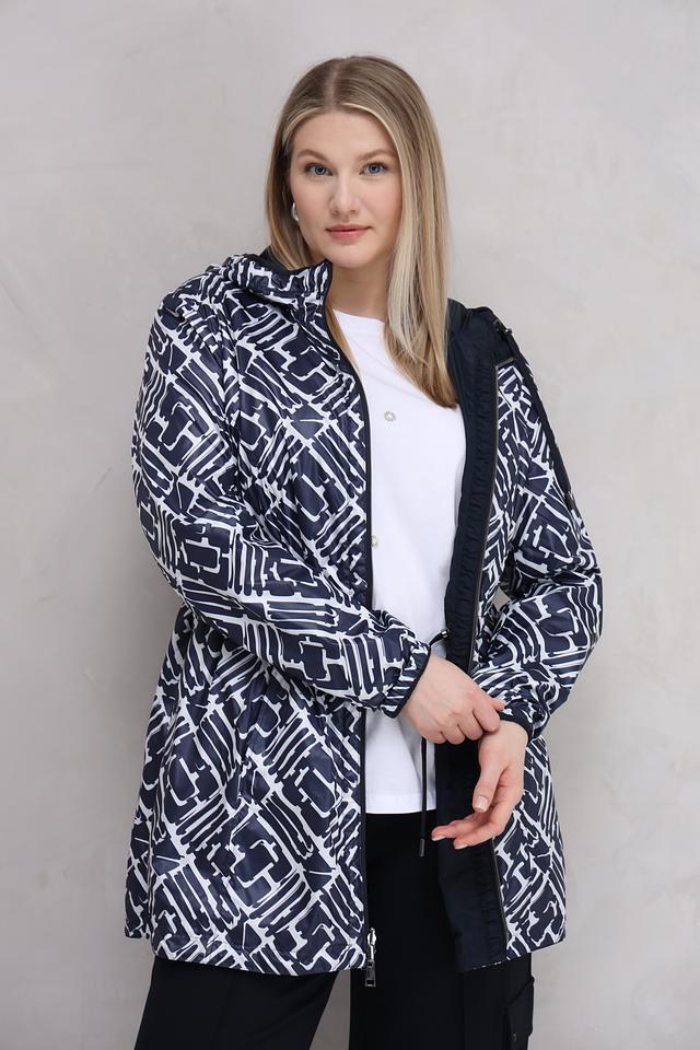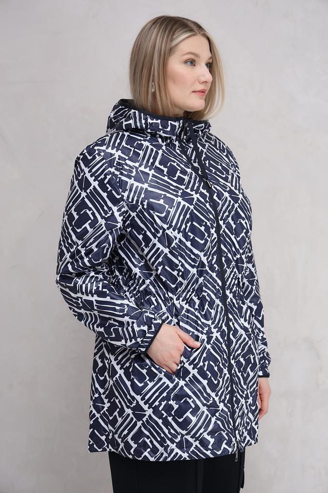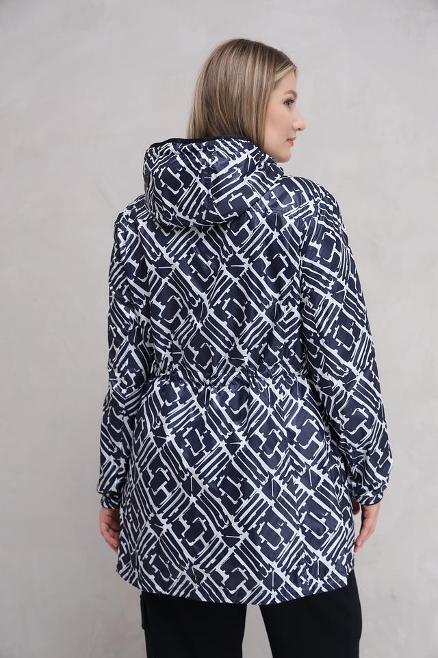 Женская куртка Lebek тёмно-синего цвета с оригинальным геометрическим принтом. Модель оснащена капюшоном и удобными карманами, идеально подходит для повседневной носки в прохладную погоду. Состав: полиэстер 100%