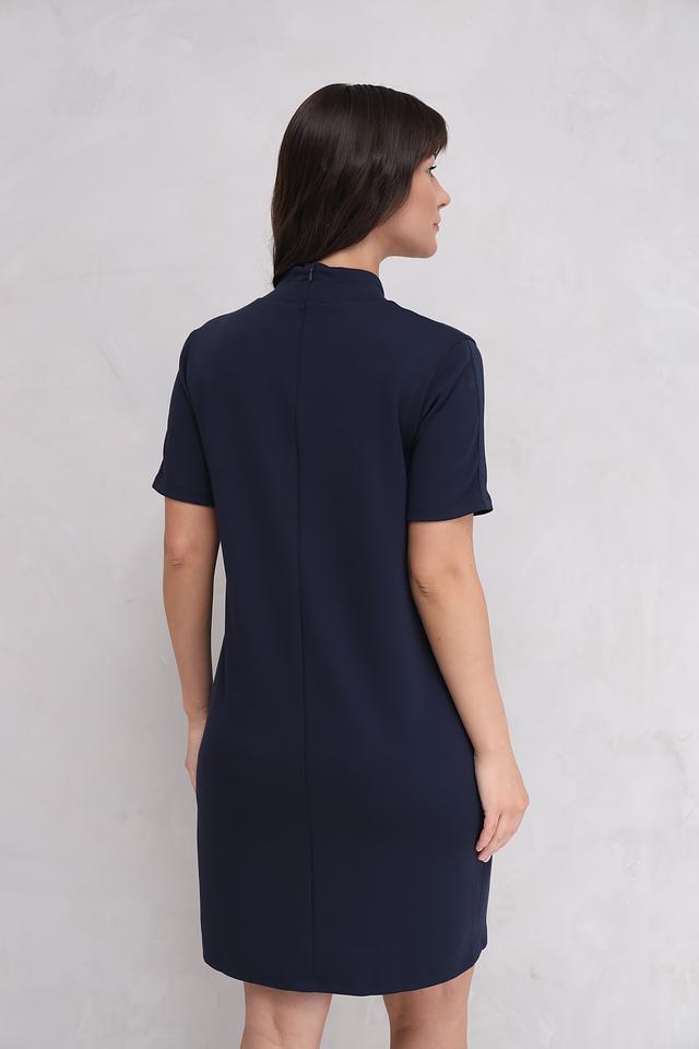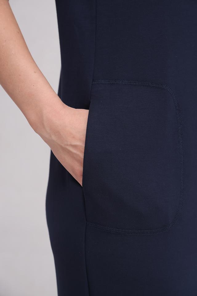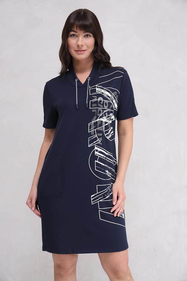 Синее платье от Lebek с коротким рукавом и оригинальным принтом. Модель выполнена из мягкой ткани с добавлением вискозы и эластана, что обеспечивает комфорт в носке и хорошую посадку по фигуре. Состав: полиэстер 50%, вискоза 45%, эластан 5%