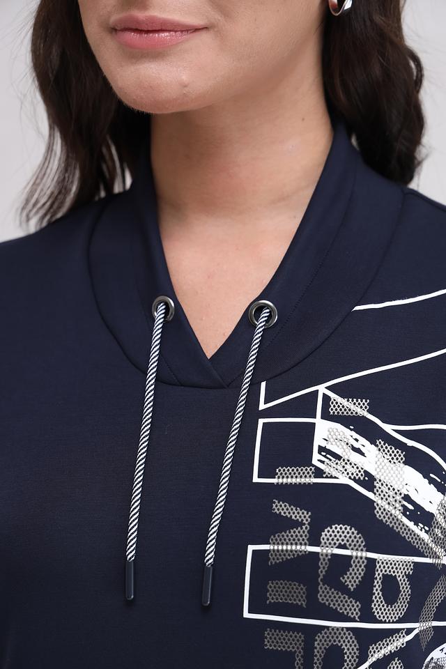 Модель имеет прямой силуэт, короткий рукав и удобный вырез горловины с небольшим воротником-стойкой. Застежка-молния в верхней части горловины позволяет регулировать степень открытия. Платье дополнено шнурками на капюшоне.