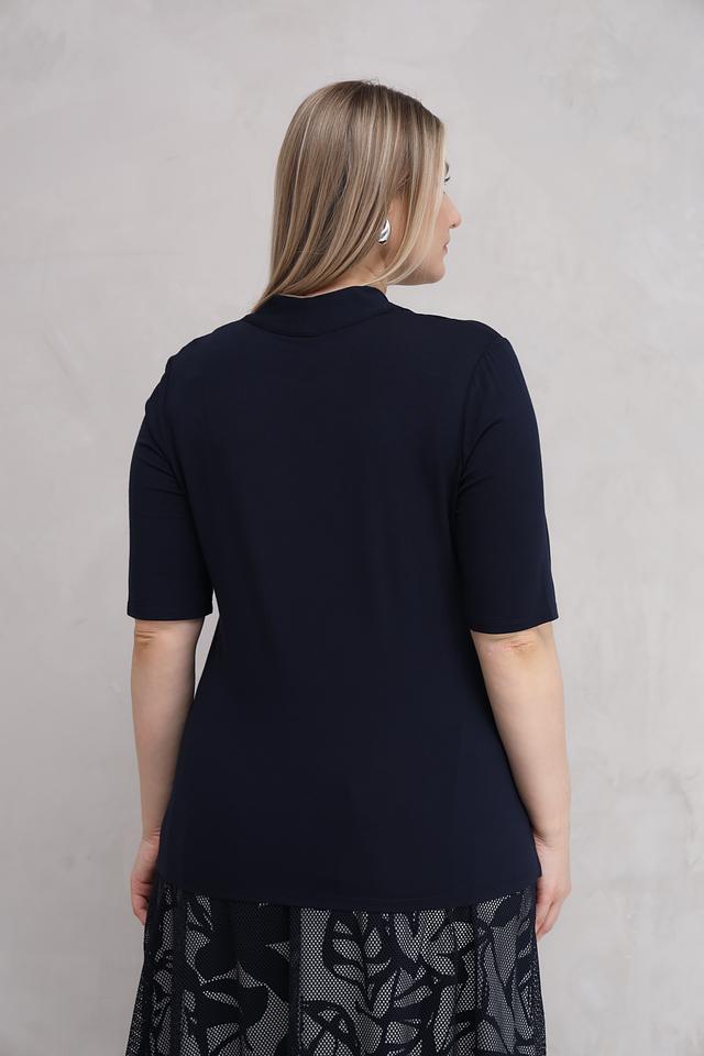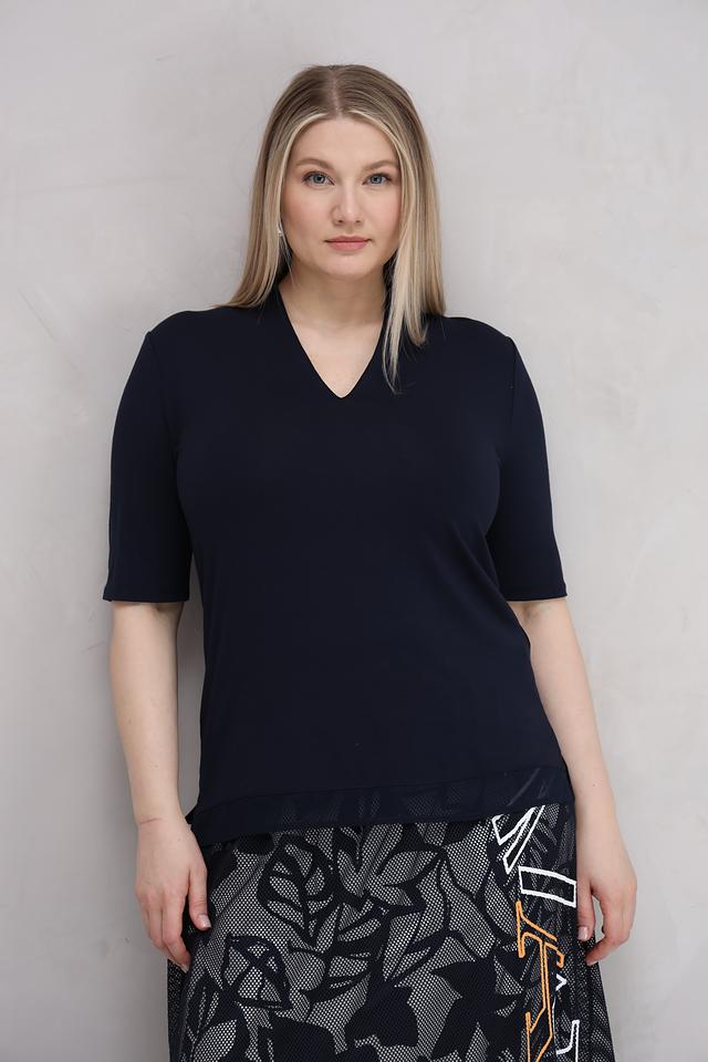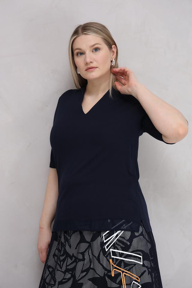 Тёмно-синяя футболка от Lebek с V-образным вырезом и короткими рукавами. Изготовлена из мягкой вискозы с добавлением эластана для комфортной посадки и свободы движений. Идеально подходит для создания повседневных образов. Состав: вискоза 95%, эластан 5%