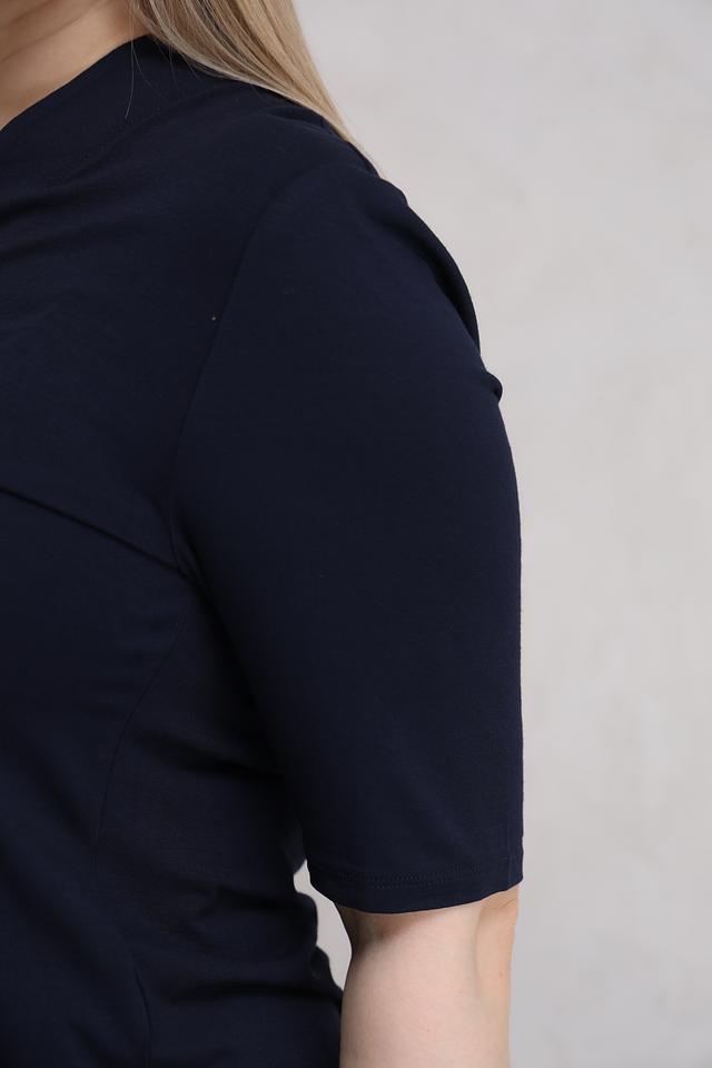 Модель имеет V-образный вырез, который визуально удлиняет шею и делает силуэт более изящным. Короткие рукава обеспечивают комфорт в теплую погоду.