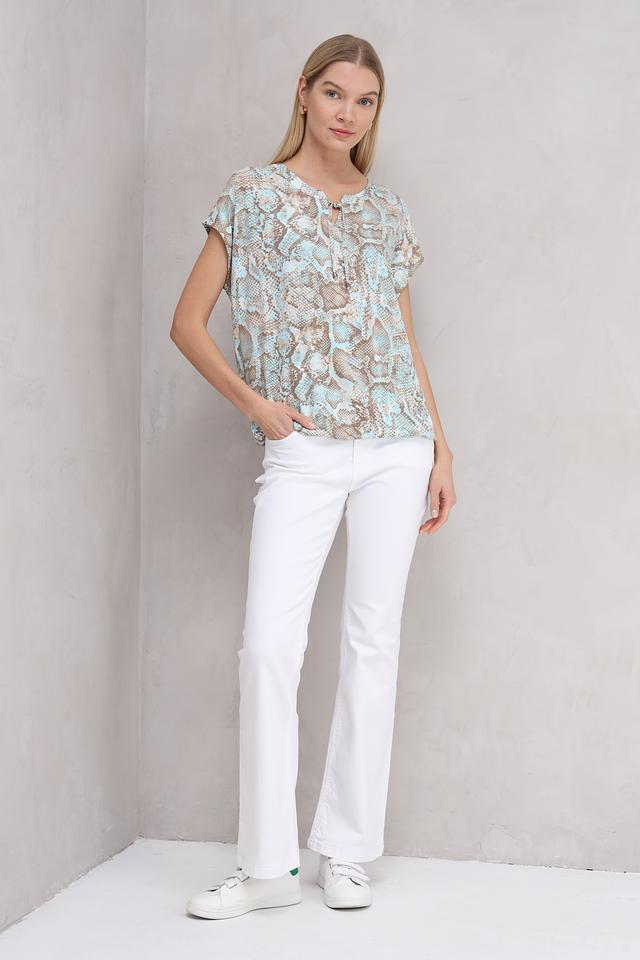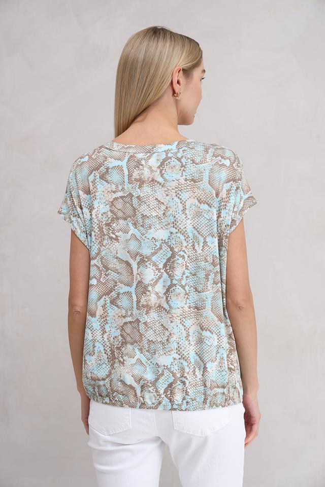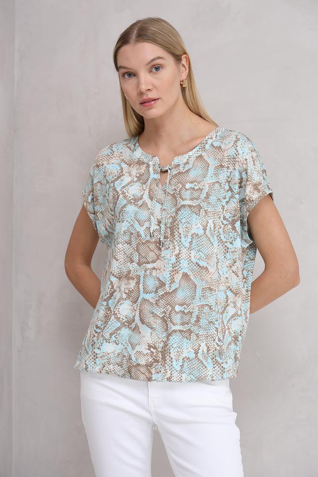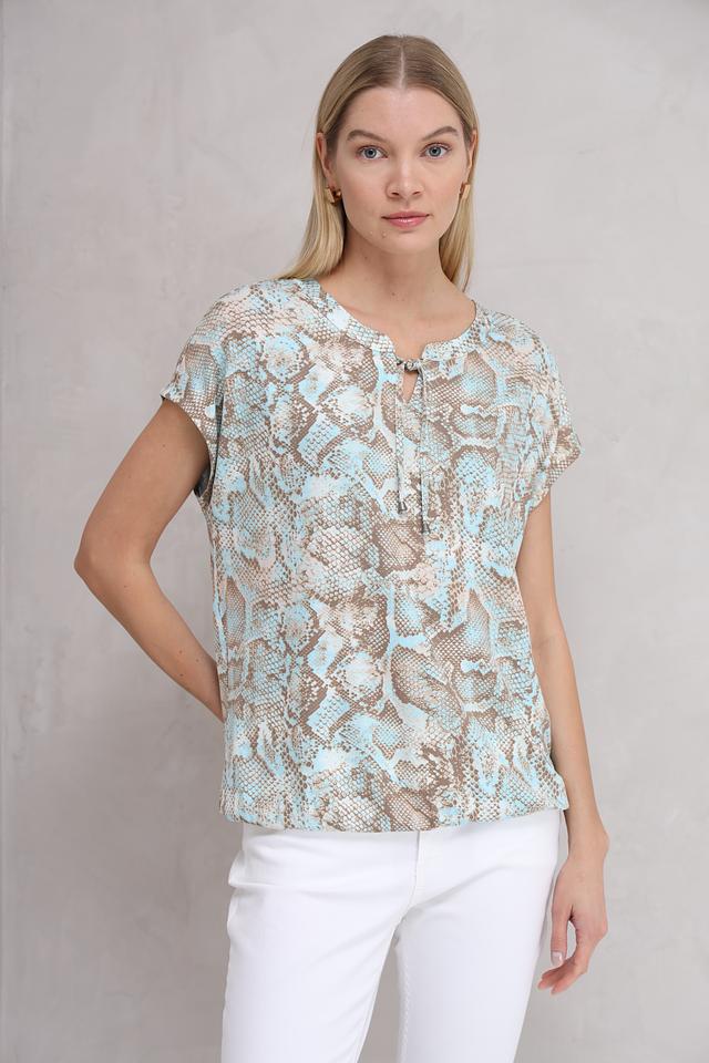 Особенностью данной модели является оригинальный принт в виде рептилии, который придает ей неповторимый стиль. Футболка имеет короткий рукав и округлый вырез горловины с небольшим разрезом и завязками.