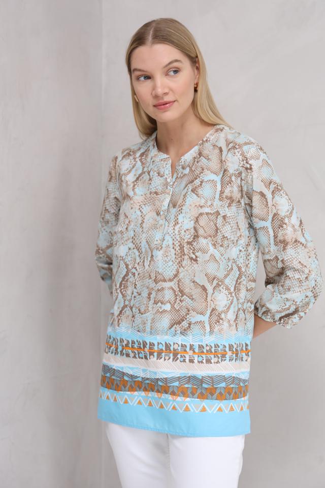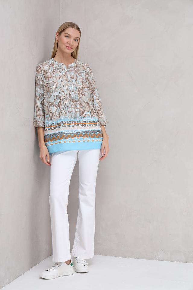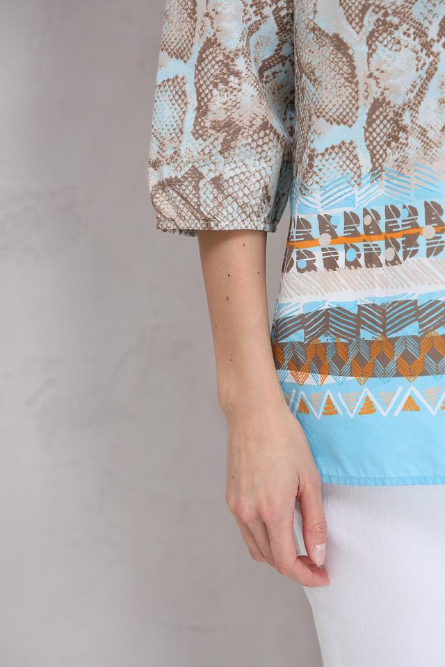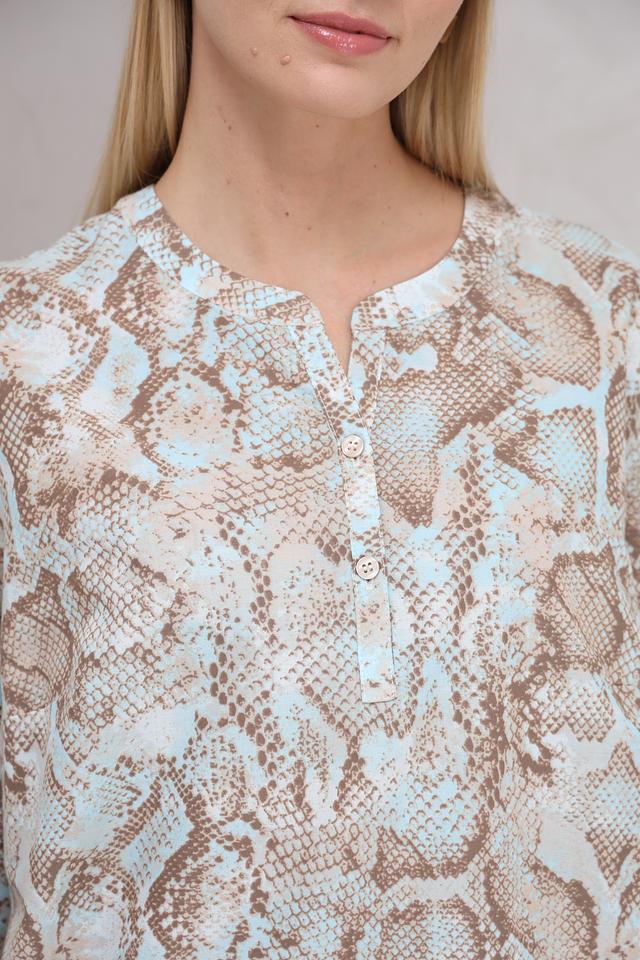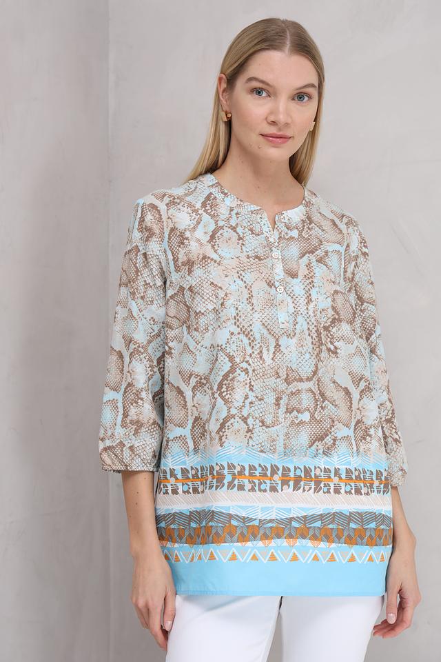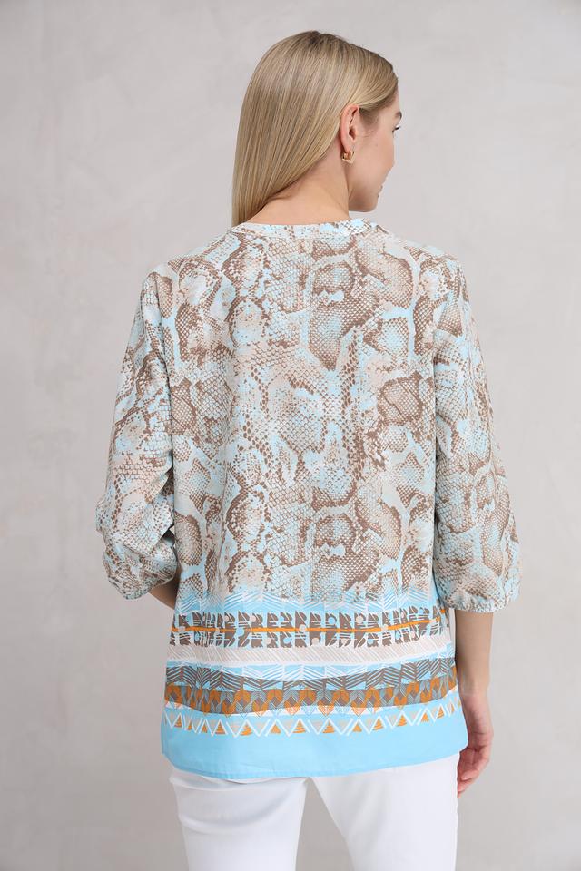 Блуза Lebek голубого цвета с оригинальным принтом в виде рептилии и геометрическим узором. Модель выполнена из 100% хлопка, имеет V-образный вырез и рукава 3/4. Состав: хлопок 100%