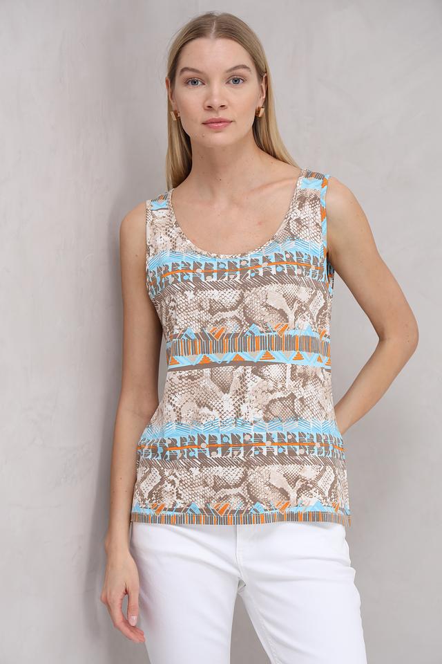 Особенностью данной модели является яркий и необычный принт, имитирующий кожу рептилии, выполненный в бежевых, оранжевых и голубых тонах. Вырез горловины округлый, а бретели тонкие. Топ идеально сочетается с джинсами, брюками или юбками, позволяя создавать разнообразные стильные комплекты.