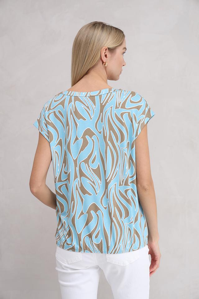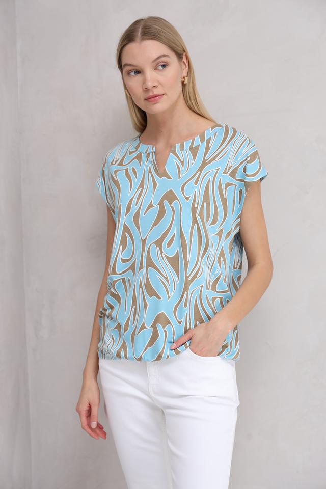 Модель имеет прямой крой и короткие рукава. Особое внимание привлекает яркий и необычный принт в абстрактном стиле, выполненный в бирюзовых и коричневых тонах. V-образный вырез горловины добавляет изысканности.
