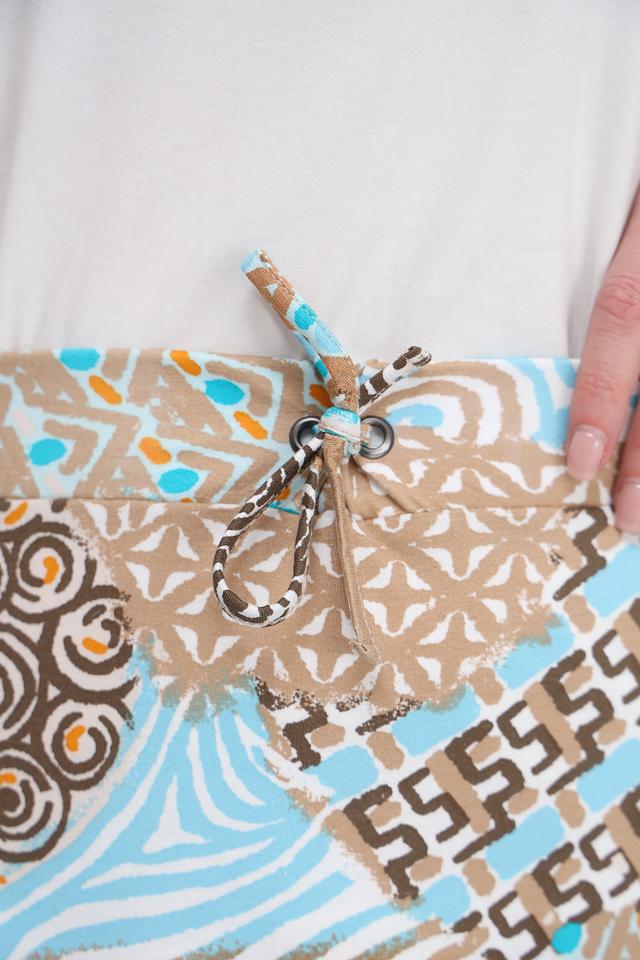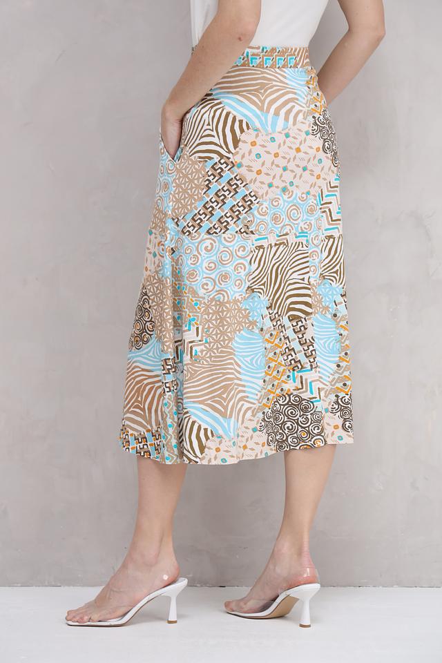 Юбка имеет длину миди и свободный крой, что делает ее универсальной для различных типов фигуры. Особенностью модели является оригинальный принт, сочетающий в себе различные геометрические узоры и оттенки.