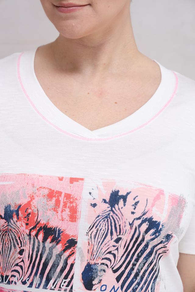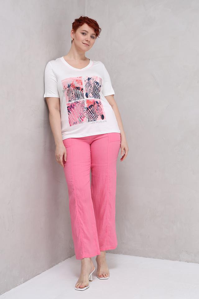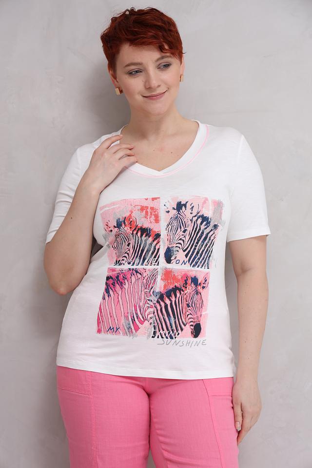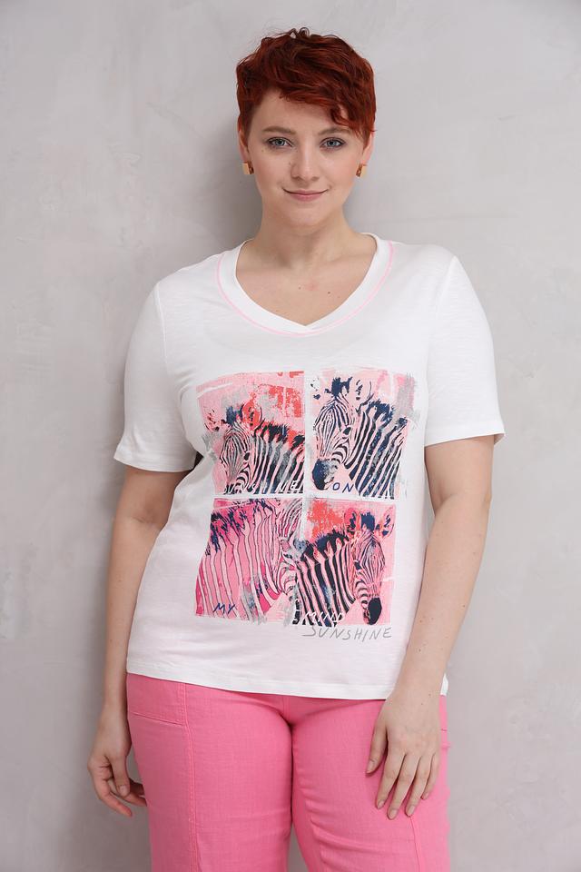 Основной цвет футболки – белый, что позволяет легко сочетать ее с различными элементами одежды. Главная особенность модели – яркий принт с изображением зебр в розовых тонах, который придает ей оригинальность и индивидуальность.