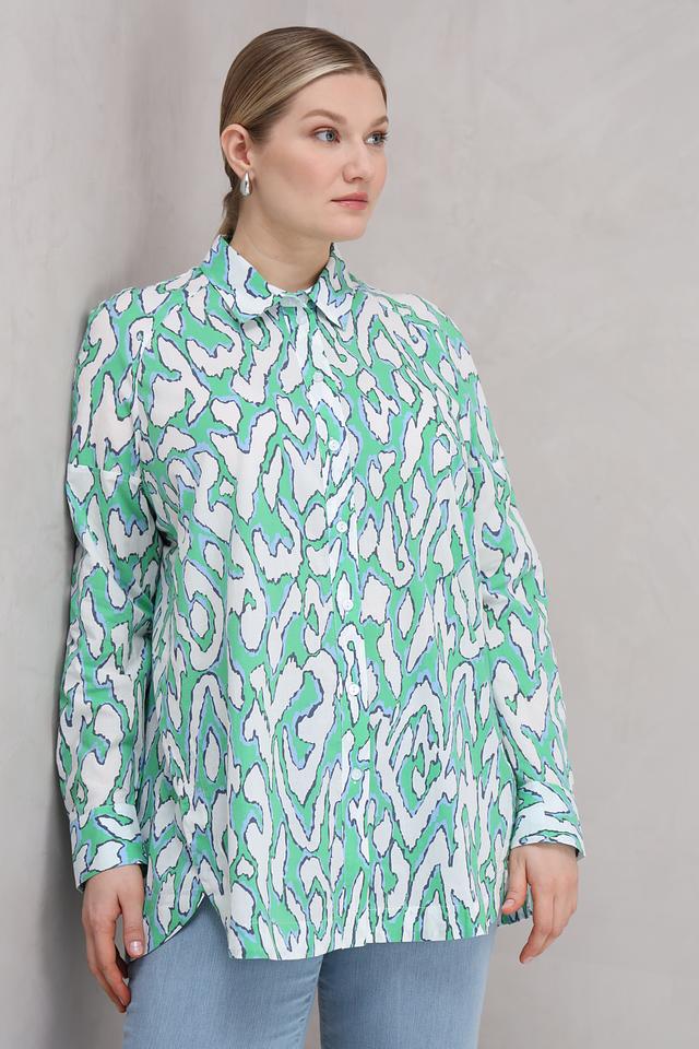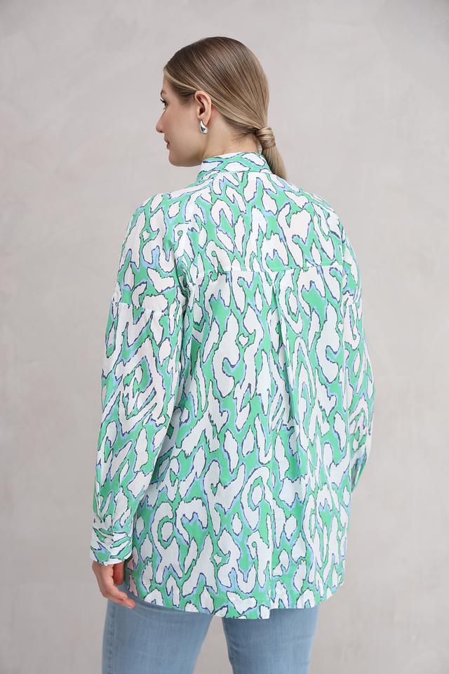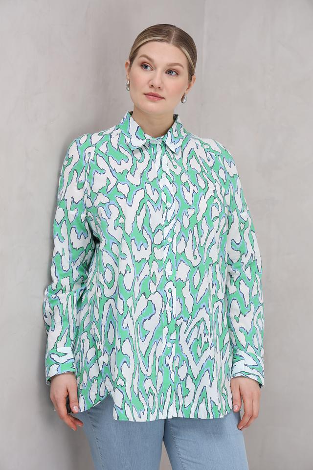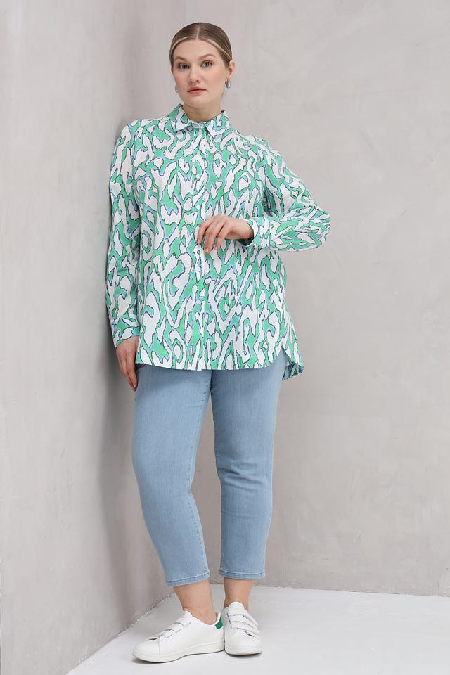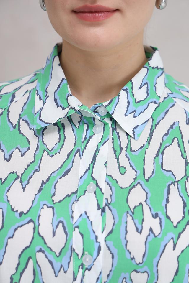 Особенностью данной модели является оригинальный принт, выполненный в зелёных и белых тонах. Принт представляет собой абстрактный узор, который придаёт блузе неповторимый стиль.
