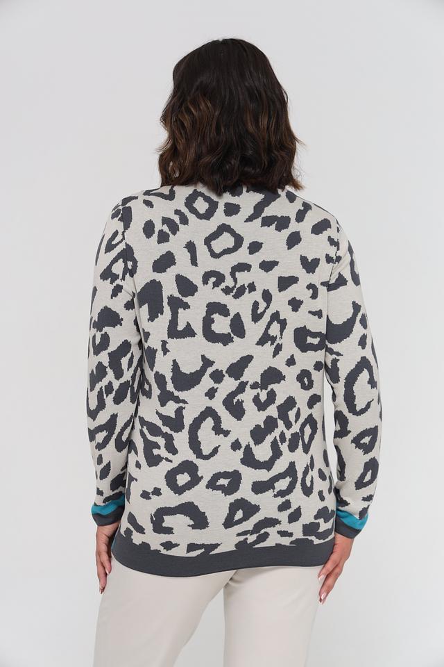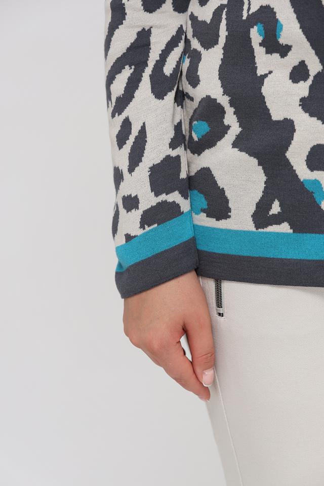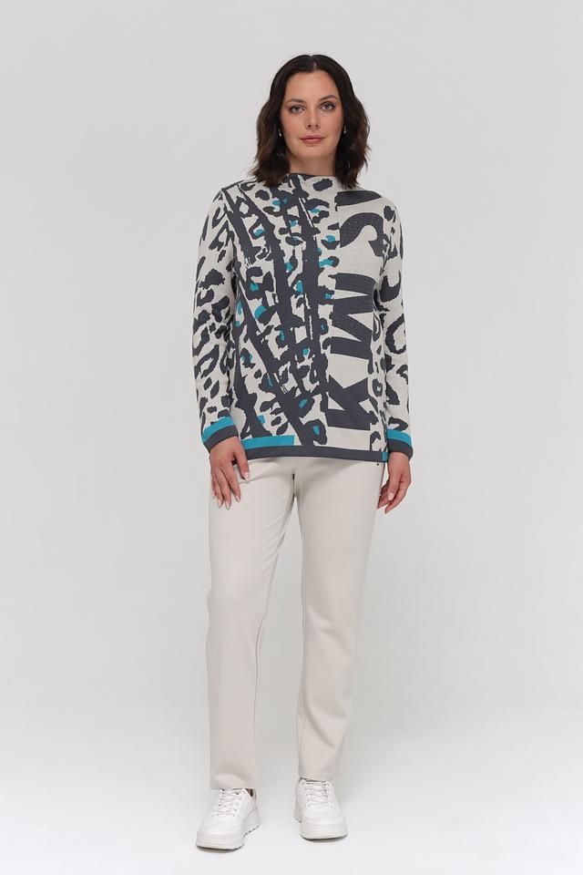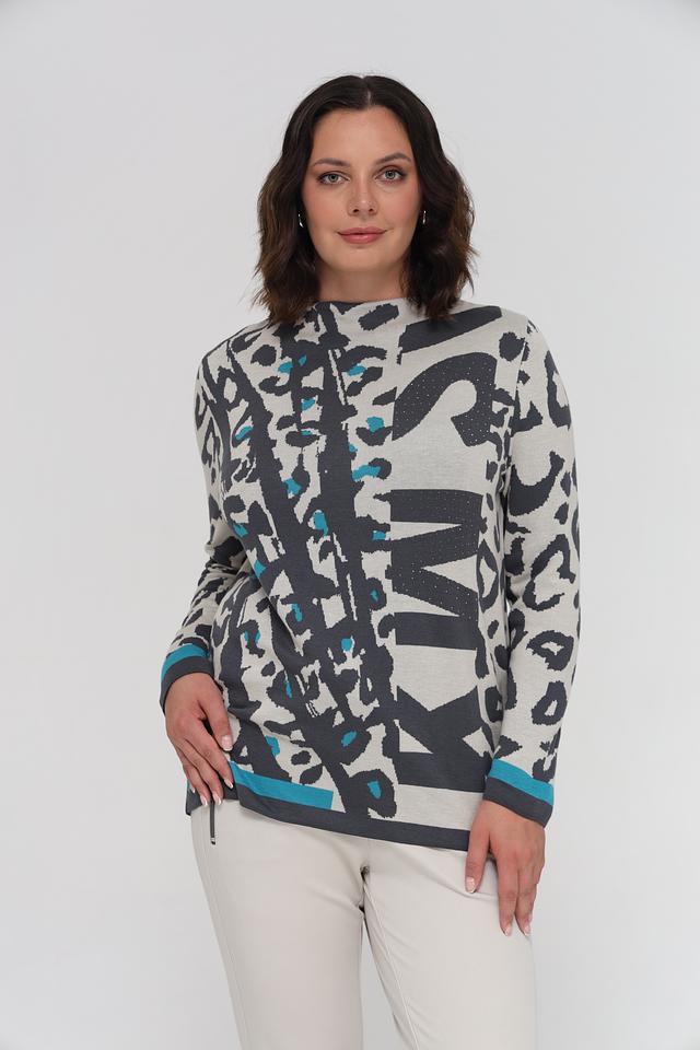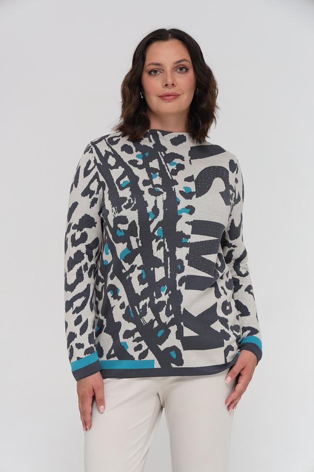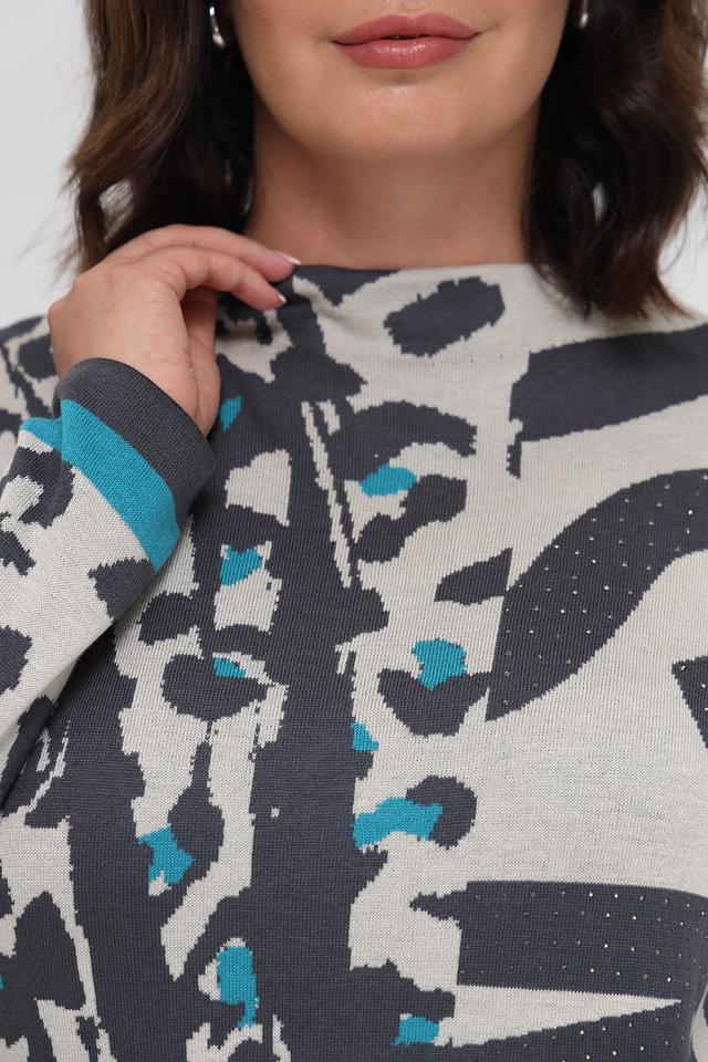 Пуловер имеет свободный крой, который не сковывает движений и позволяет чувствовать себя комфортно в любой ситуации. Особенностью модели является яркий и запоминающийся принт, выполненный в серой цветовой гамме с добавлением бирюзовых акцентов. Декоративная отделка манжет и низа изделия выполнена в бирюзовом цвете, что добавляет пуловеру оригинальности.