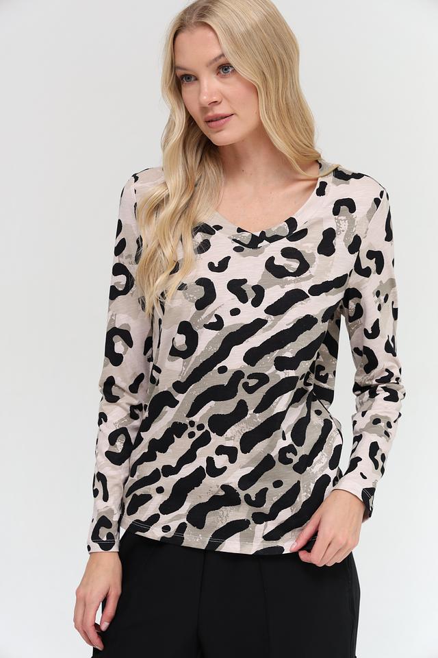 Лонгслив имеет свободный крой, который не сковывает движения. V-образный вырез горловины придает образу женственность. Главная особенность модели – эффектный принт, сочетающий в себе элементы анималистических рисунков.