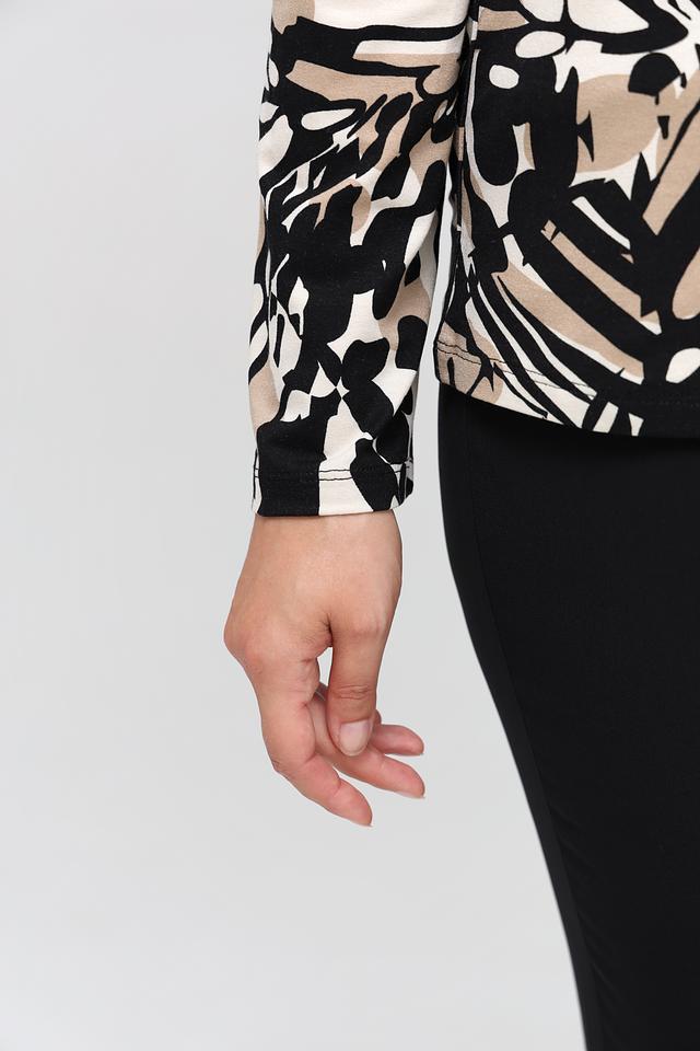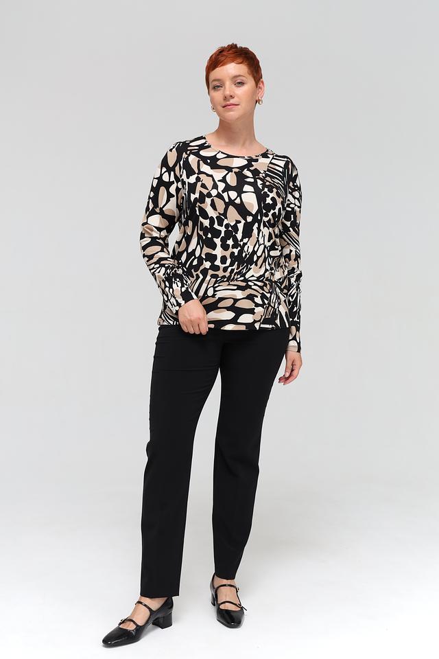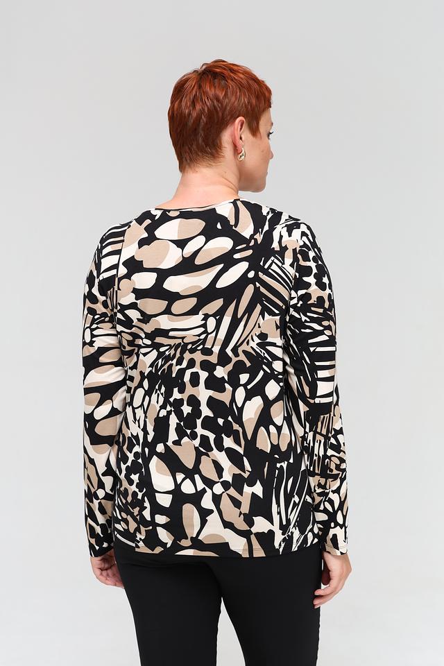 Футболка имеет длинные рукава и классический округлый вырез горловины. Главная особенность модели – эффектный абстрактный принт в бежевых и чёрных тонах, который придаёт ей изысканность и оригинальность.