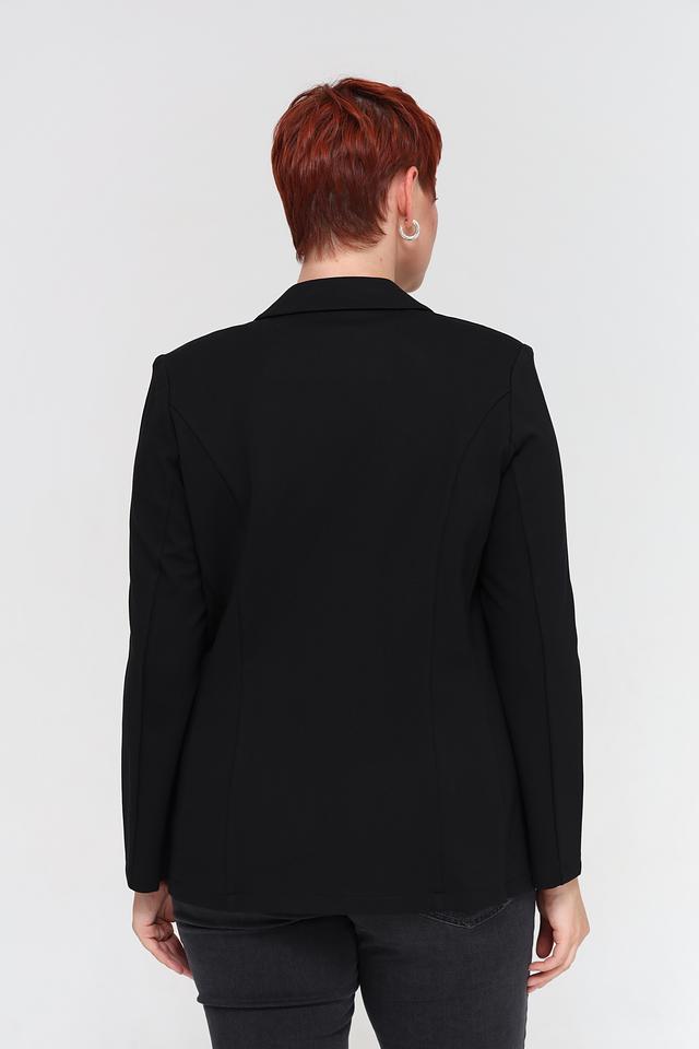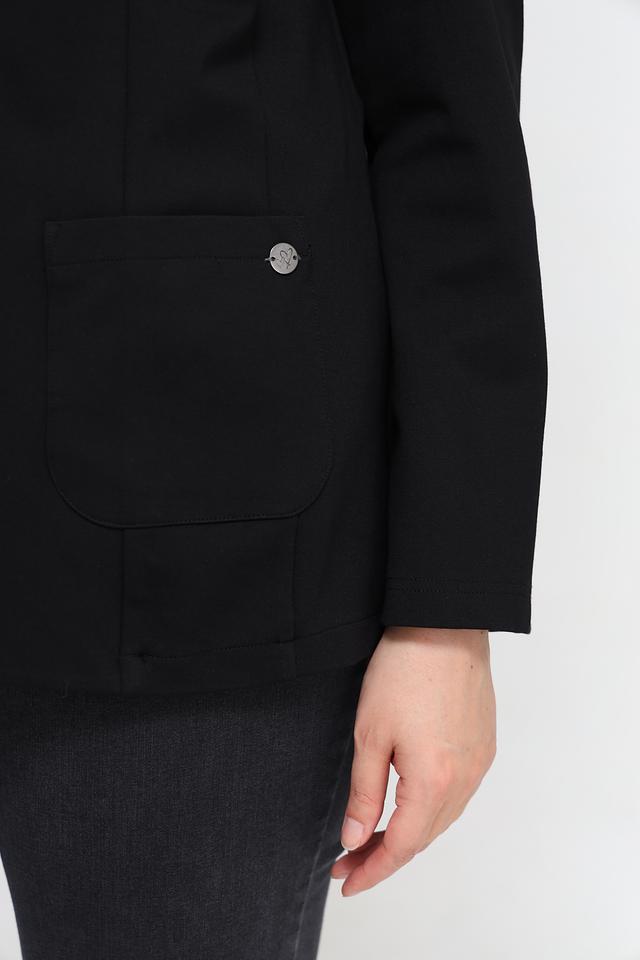 Жакет имеет однобортную застёжку на две пуговицы, стандартные лацканы и два функциональных кармана с клапанами. Длинные рукава и прямой силуэт обеспечивают комфортную посадку. Материал – сочетание вискозы, полиамида и эластана – приятен к телу, хорошо держит форму и обеспечивает свободу движений.