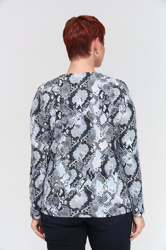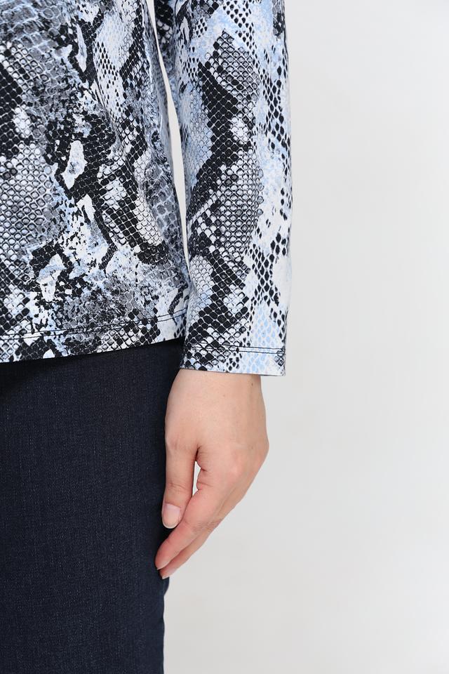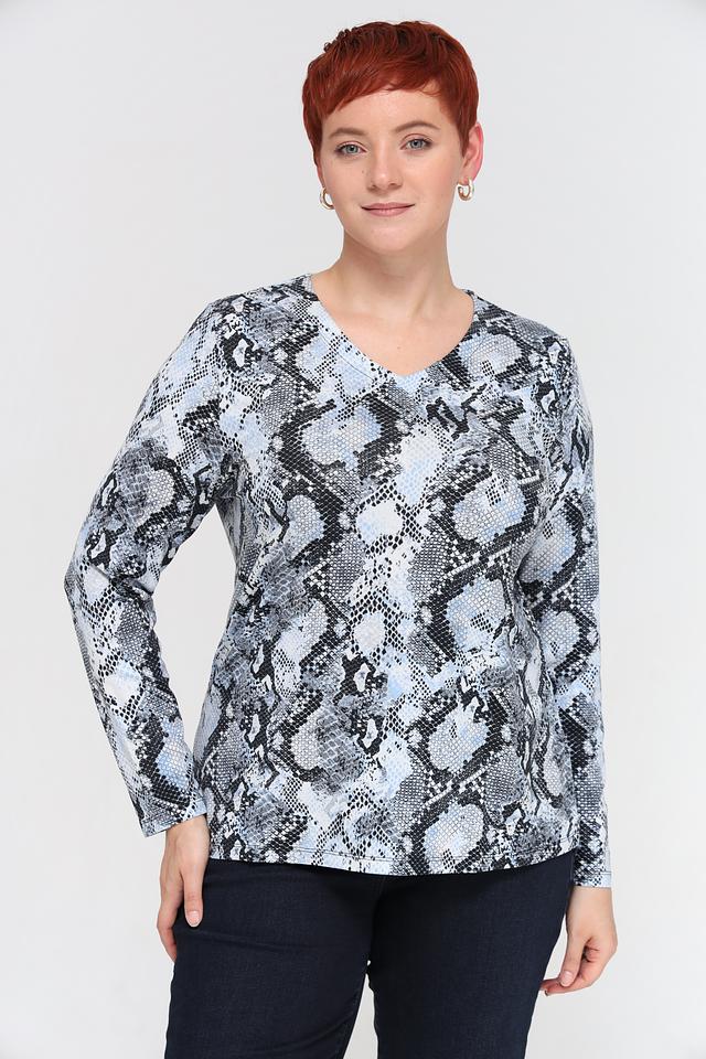 Женская футболка Lebek светло-серого цвета с оригинальным принтом, имитирующим змеиную кожу. Изготовлена из мягкой и приятной к телу вискозы с добавлением эластана для комфортной посадки. Идеально подходит для создания стильного повседневного образа. Состав: вискоза 94%, эластан 6%
