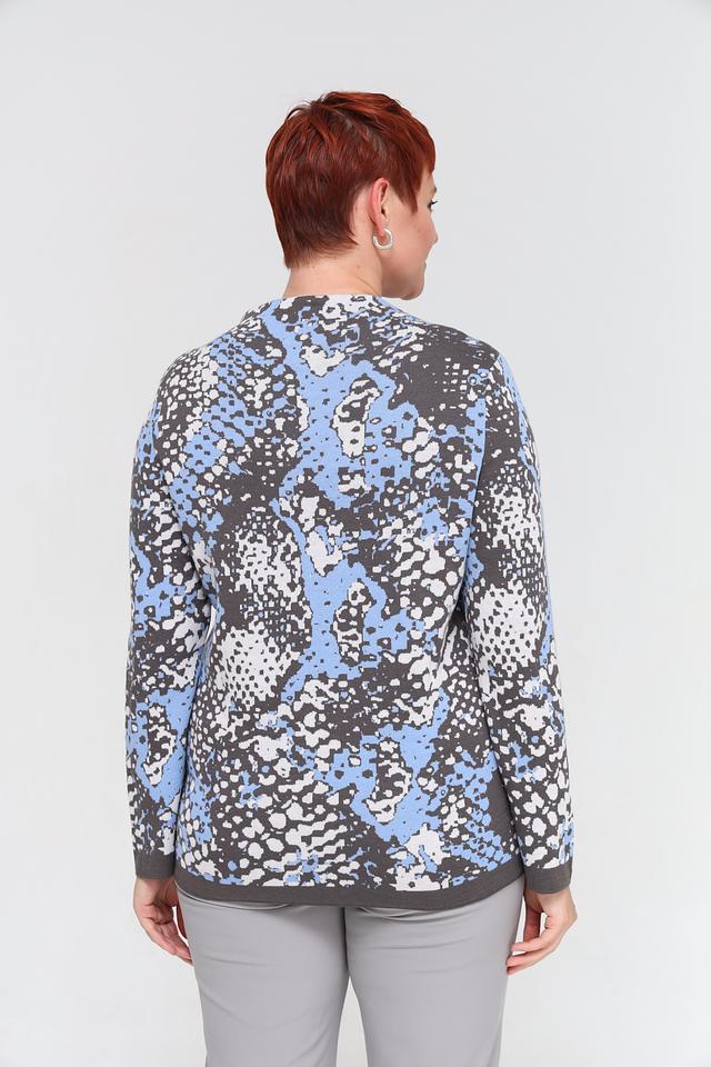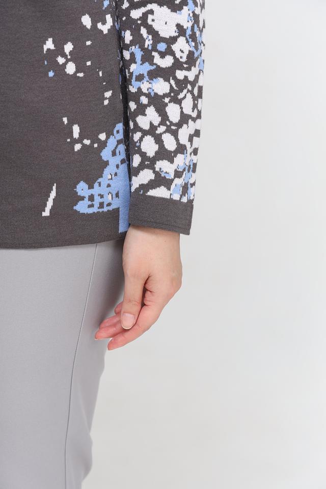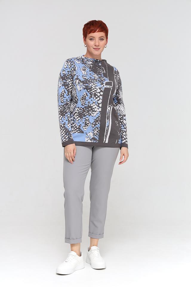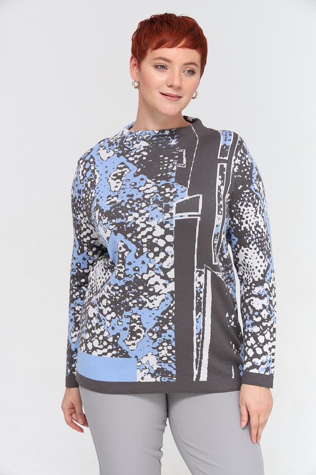 Пуловер имеет свободный крой, который обеспечивает комфорт и свободу движений. Особенностью модели является яркий и необычный принт, выполненный в голубых, серых и белых тонах. Принт создает интересный визуальный эффект и делает этот пуловер уникальным.