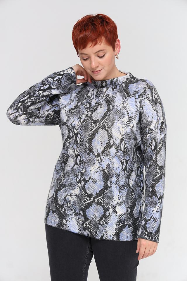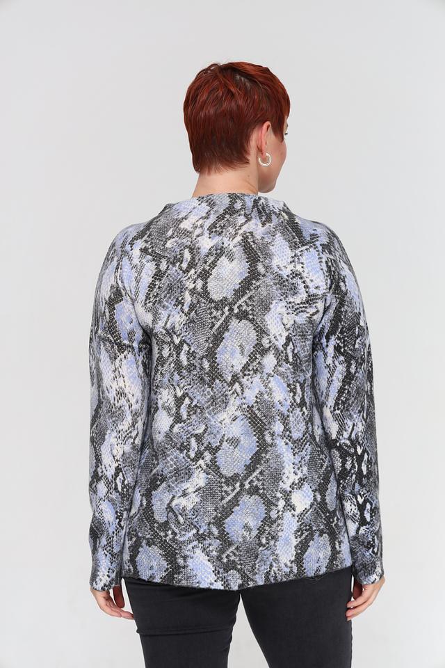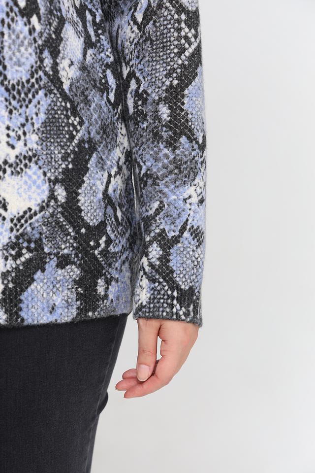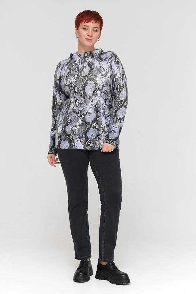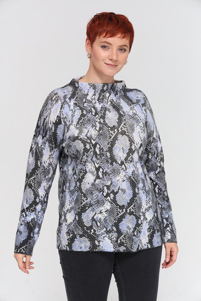 Пуловер имеет свободный крой, который не сковывает движений и позволяет создать расслабленный силуэт. Высокий круглый вырез горловины делает его универсальным для различных стилей. Главная особенность модели – эффектный принт, имитирующий кожу рептилии, который добавит изюминку вашему гардеробу.