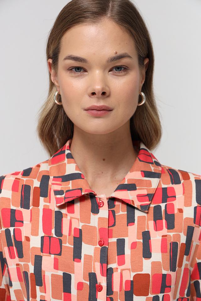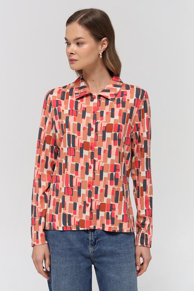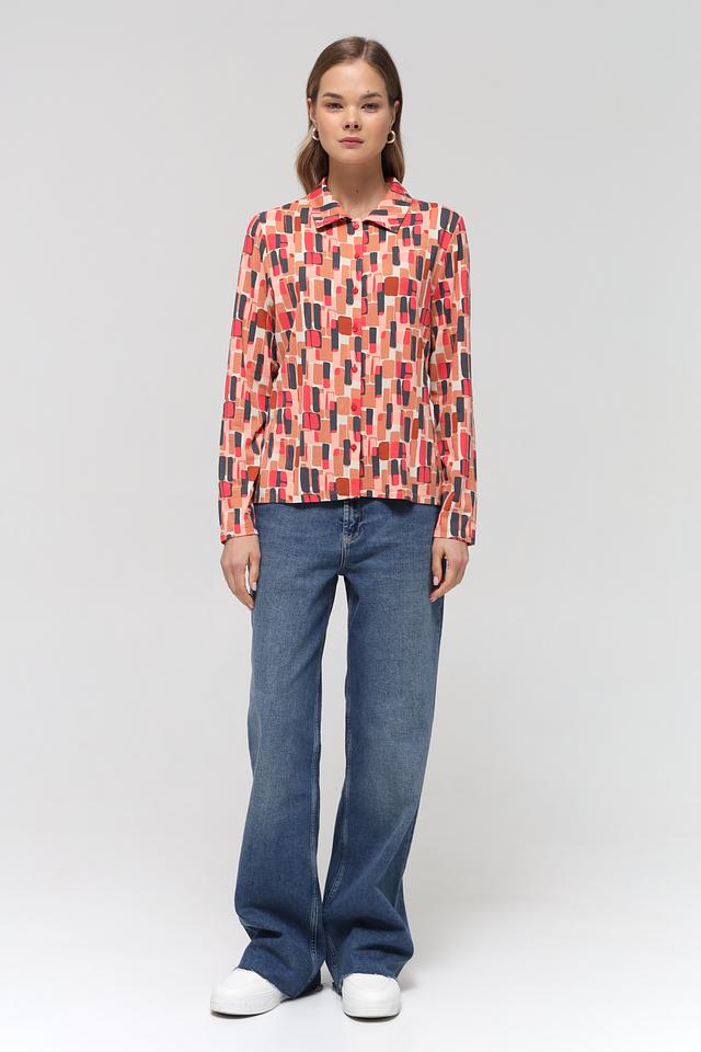 Особенностью данной модели является яркий абстрактный принт в оранжевой гамме с добавлением коричневых и черных оттенков. Классический воротник и длинные рукава делают эту блузу универсальной и подходящей для различных случаев.