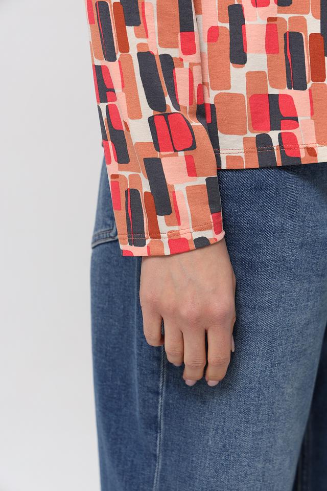 Блуза Lebek оранжевого цвета с оригинальным абстрактным принтом станет ярким акцентом вашего образа. Модель с длинными рукавами и классическим воротником выполнена из мягкой вискозы с добавлением эластана. Состав: вискоза 96%, эластан 4%
