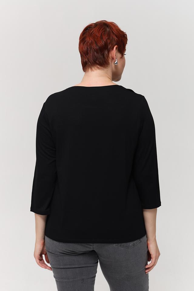 Чёрная футболка Lebek из вискозы с оригинальным геометрическим узором. Модель с рукавом 3/4 и округлым вырезом горловины. Состав: 95% вискоза, 5% эластан. Состав: вискоза 95%, эластан 5%
