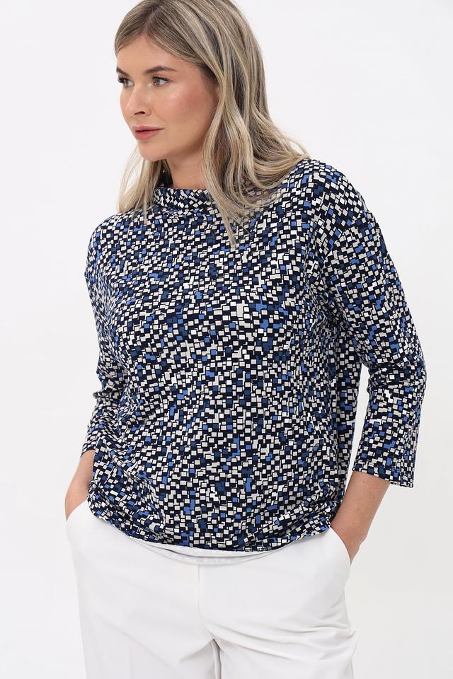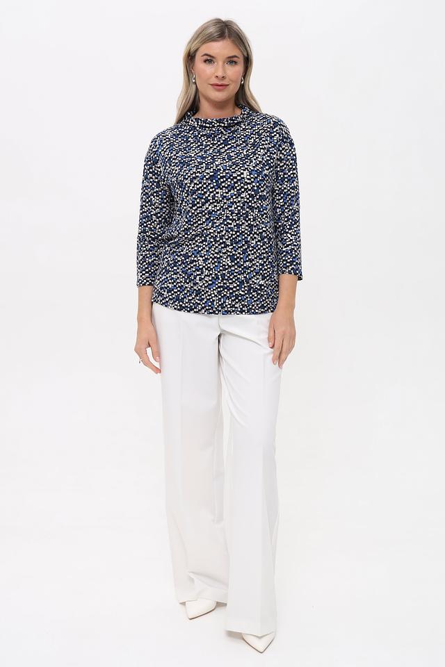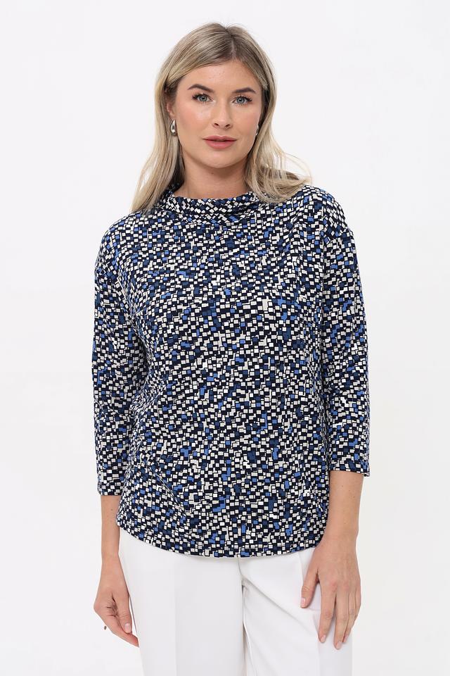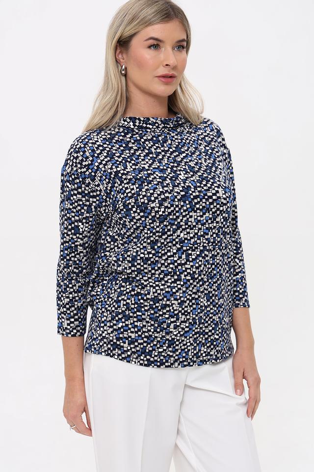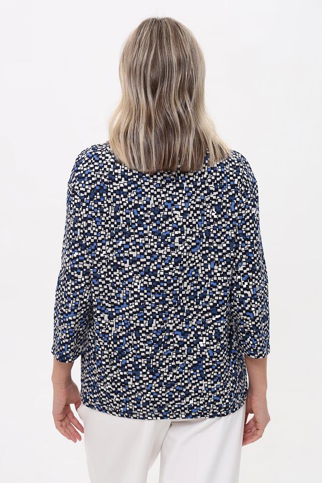 Футболка имеет прямой крой и короткий рукав 3/4, что делает ее универсальной для различных типов фигур. Главной особенностью модели является яркий геометрический принт в синих и белых тонах, который придаёт ей оригинальность и выразительность.
