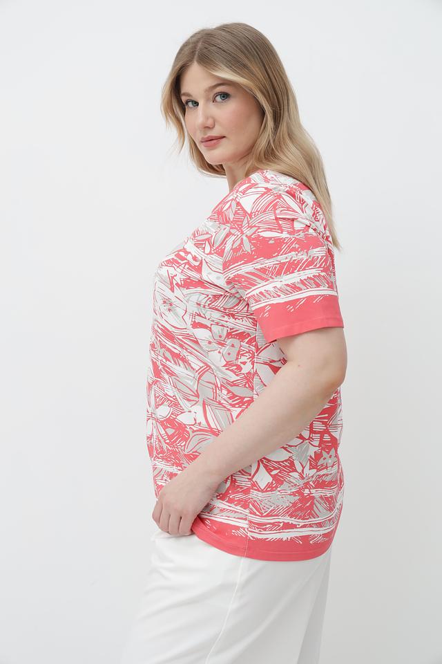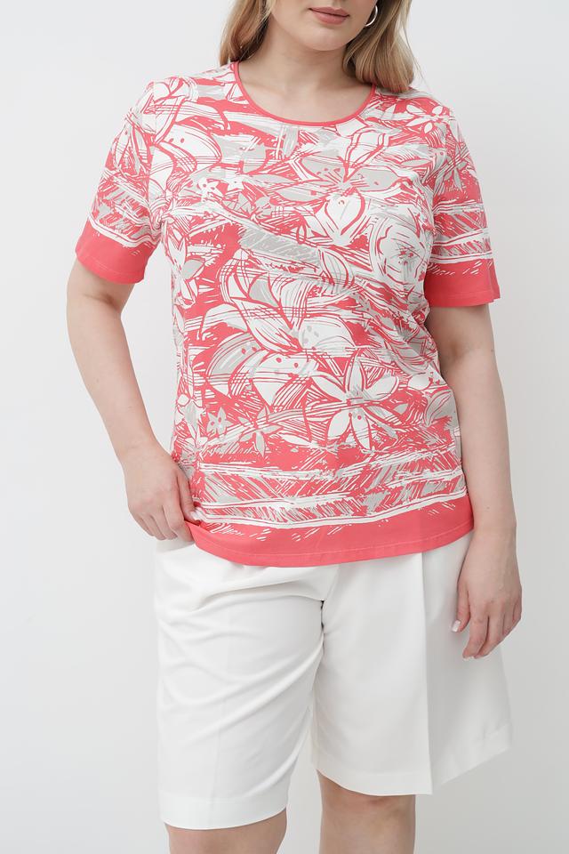 Модель имеет прямой крой, короткий рукав и круглый вырез горловины. Футболка украшена ярким цветочным принтом в коралловых и белых тонах, который придаёт ей летнее настроение.