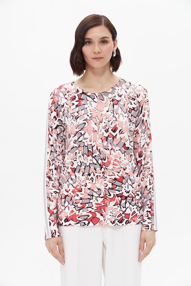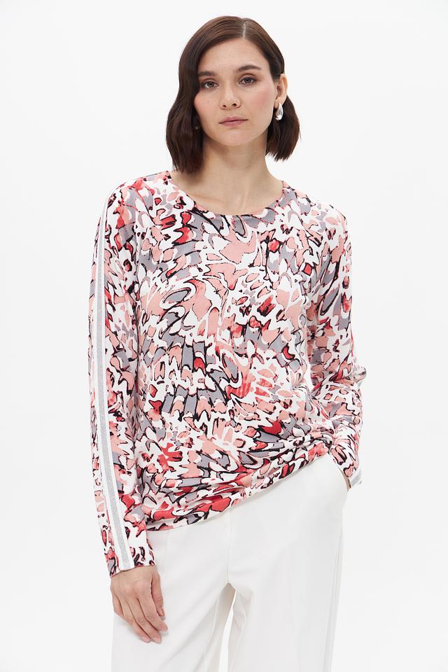 Женский пуловер Lebek нежно-розового цвета с оригинальным абстрактным принтом и контрастными полосками на рукавах. Модель выполнена из мягкой вискозы, обеспечивающей комфорт в носке. Состав: вискоза 69%, полиамид 30%, метализ.нить 1%