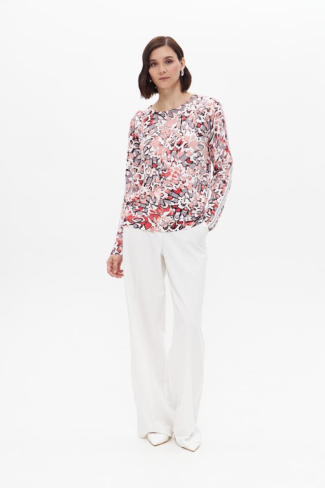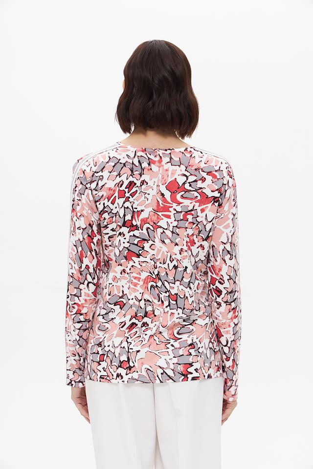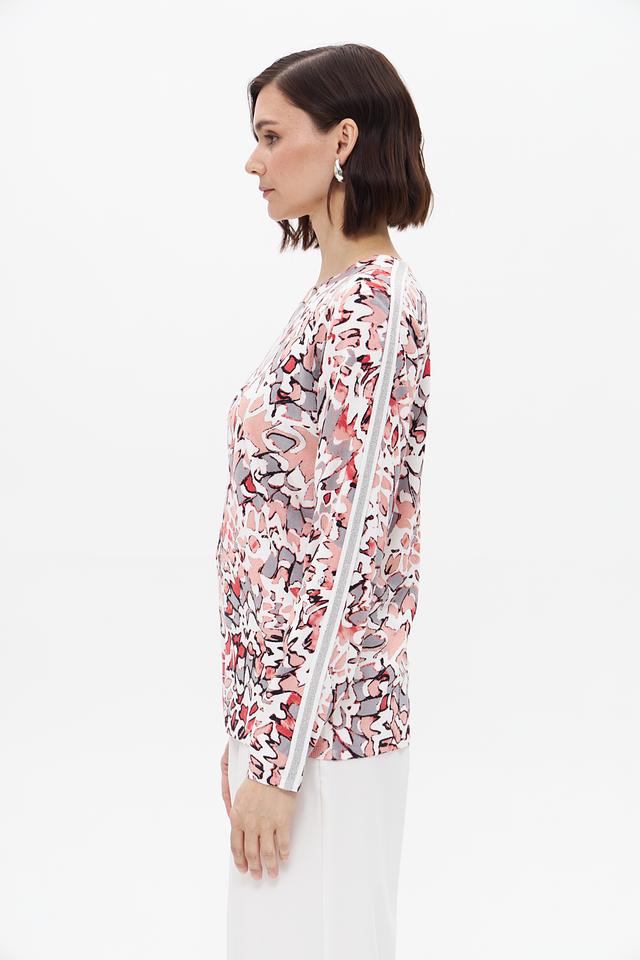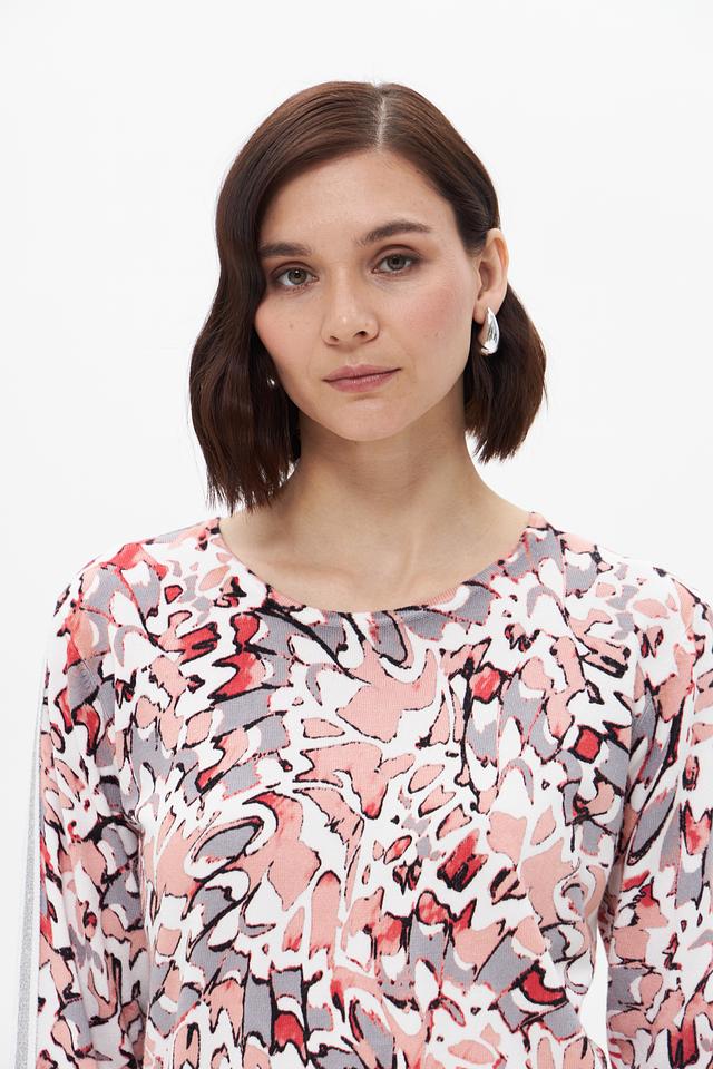 Пуловер имеет округлый вырез горловины и длинные рукава, украшенные контрастными полосками. Нежный розовый цвет и абстрактный принт делают этот пуловер особенно привлекательным и женственным.