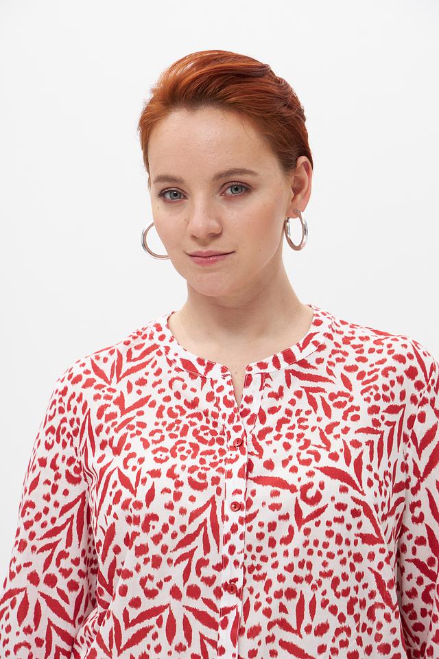 Особое внимание привлекает яркий принт с цветочным и геометрическим орнаментом в красных тонах на белом фоне. Эта блузка идеально подойдет для создания как повседневных, так и более нарядных образов. Она легко сочетается с брюками, юбками и джинсами.