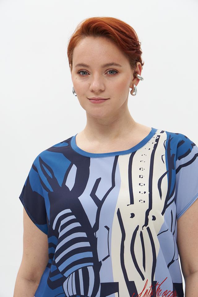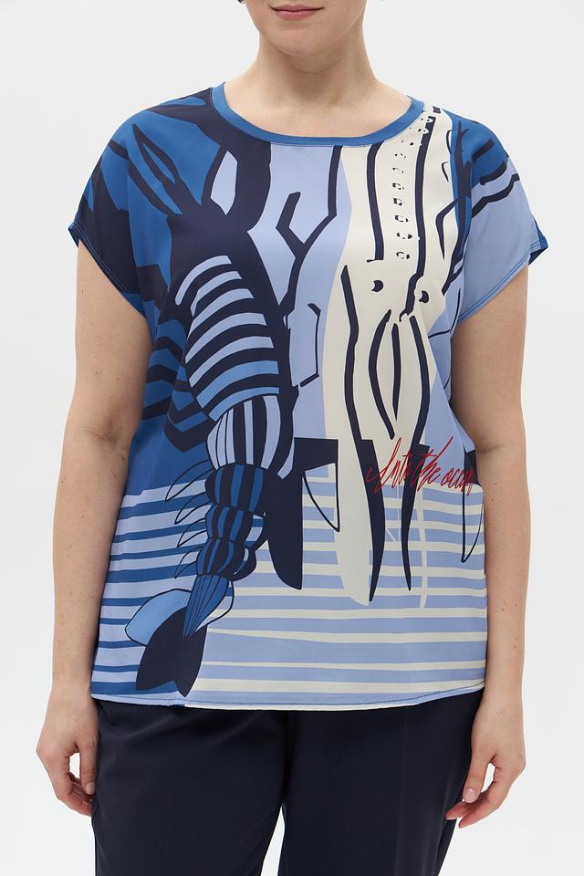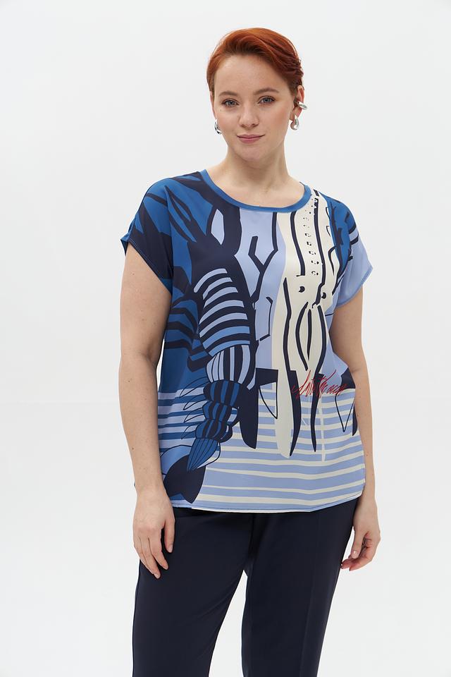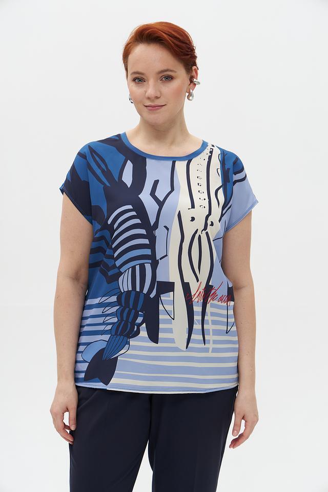 Блузка имеет свободный крой, короткие рукава и округлый вырез горловины. Главная особенность – эффектный принт с изображением креветок в сочетании полосок и абстрактных элементов. Цветовая гамма включает оттенки голубого, белого и синего.