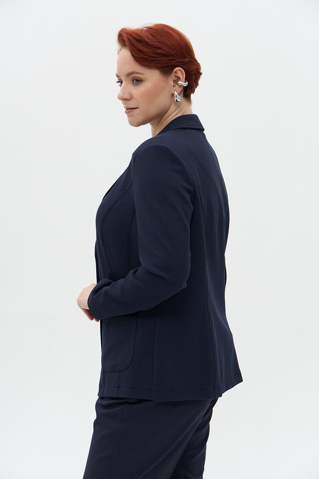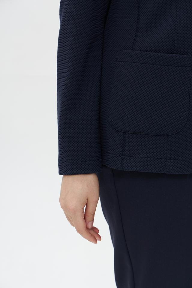 Жакет имеет классический лацкан, длинные рукава и застегивается на две пуговицы в тон ткани. На передней части расположены два функциональных кармана с клапанами. Ткань жакета имеет выраженную текстуру с мелким рисунком, что придает ему особый шарм.