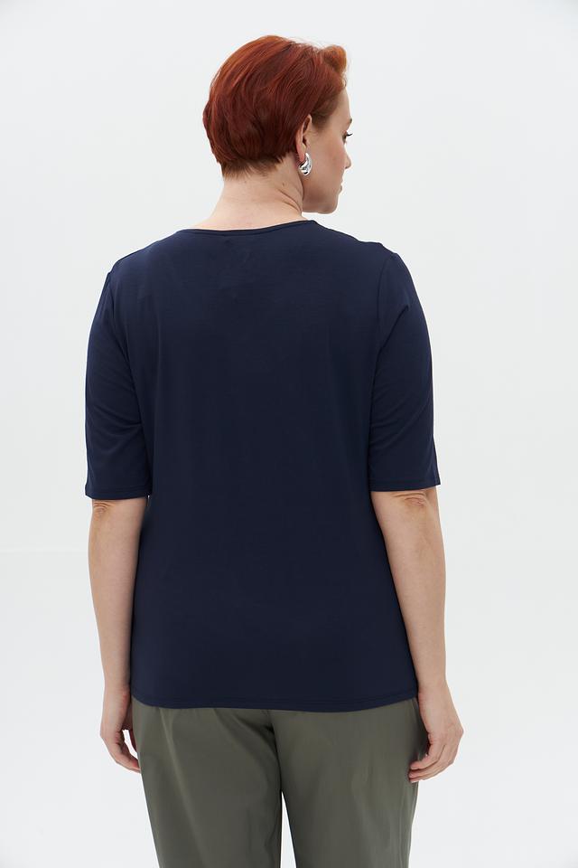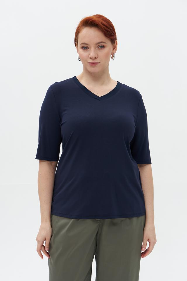 Модель имеет классический V-образный вырез, который визуально удлиняет шею и делает силуэт более изящным. Короткие рукава обеспечивают комфорт в теплую погоду.