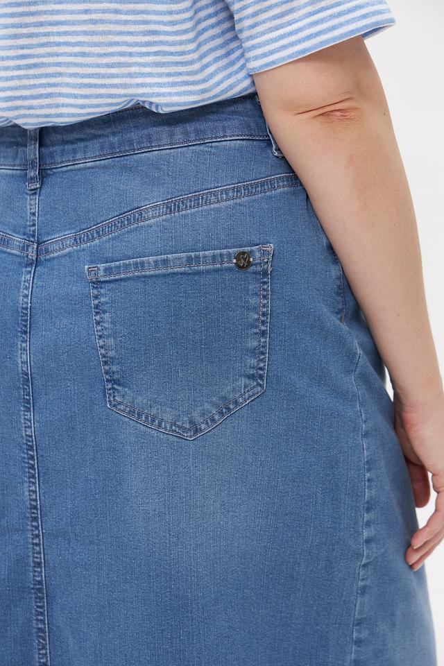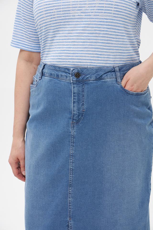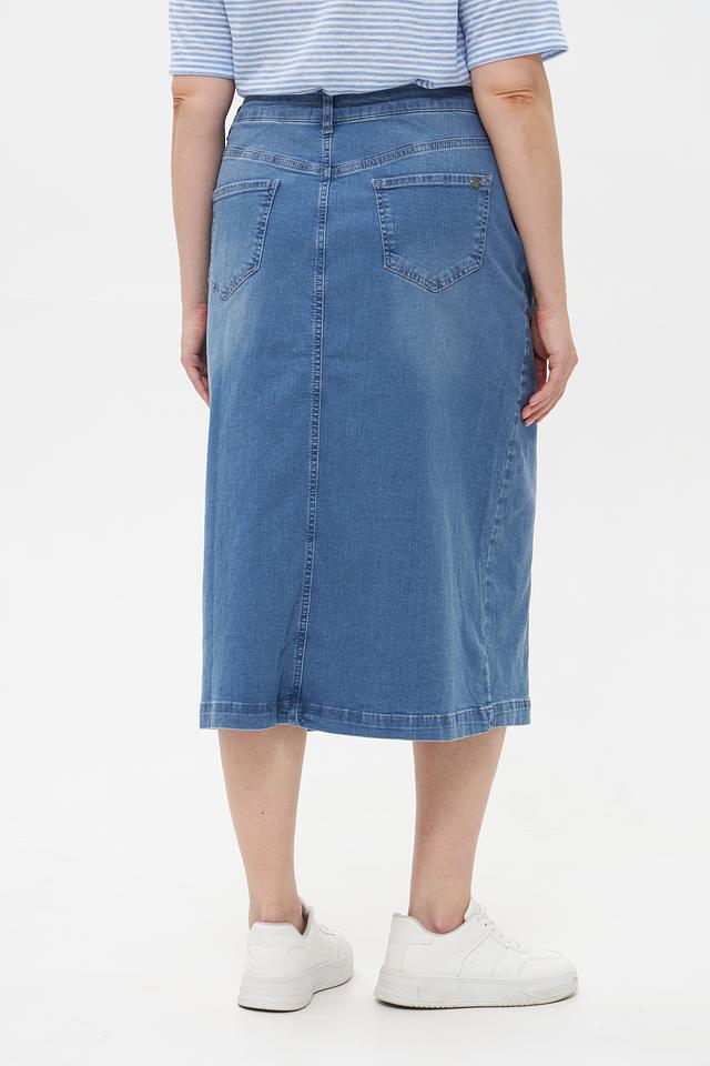Джинсовая юбка Lebek голубого цвета, средней длины и с разрезом спереди. Изготовлена из хлопка с добавлением эластана для комфорта и свободы движений. Состав: хлопок 97%, эластан 3%