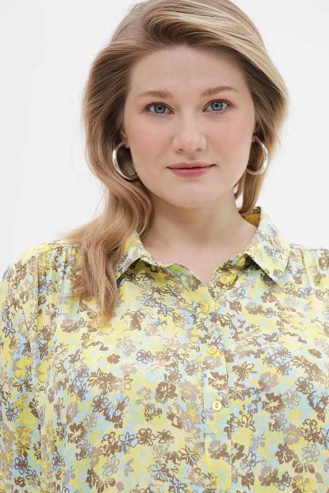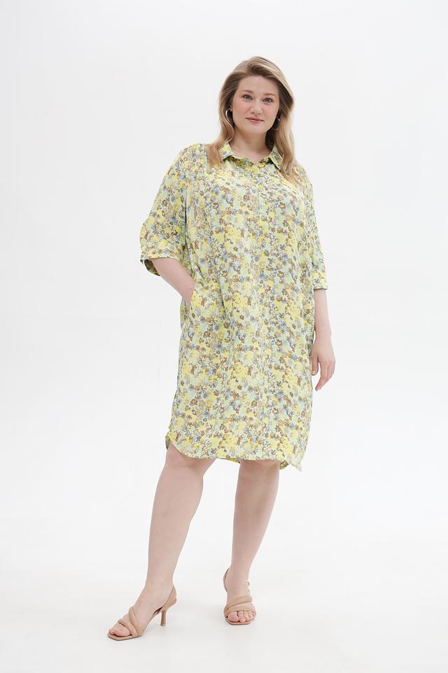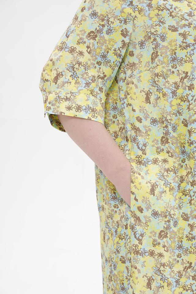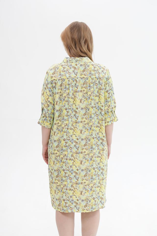 Платье имеет прямой силуэт, короткий рукав и воротник рубашка. Застёжка на пуговицах. Модель дополнена двумя накладными карманами. Нежный цветочный принт добавляет образу романтичности и лёгкости.