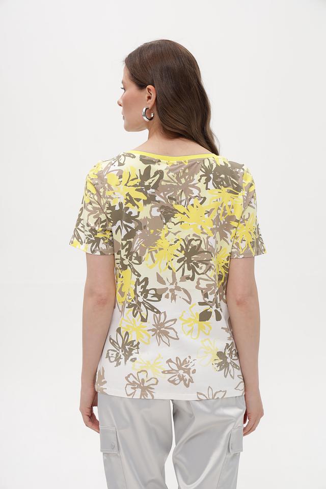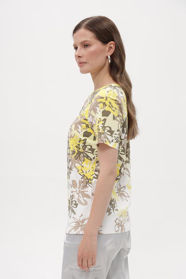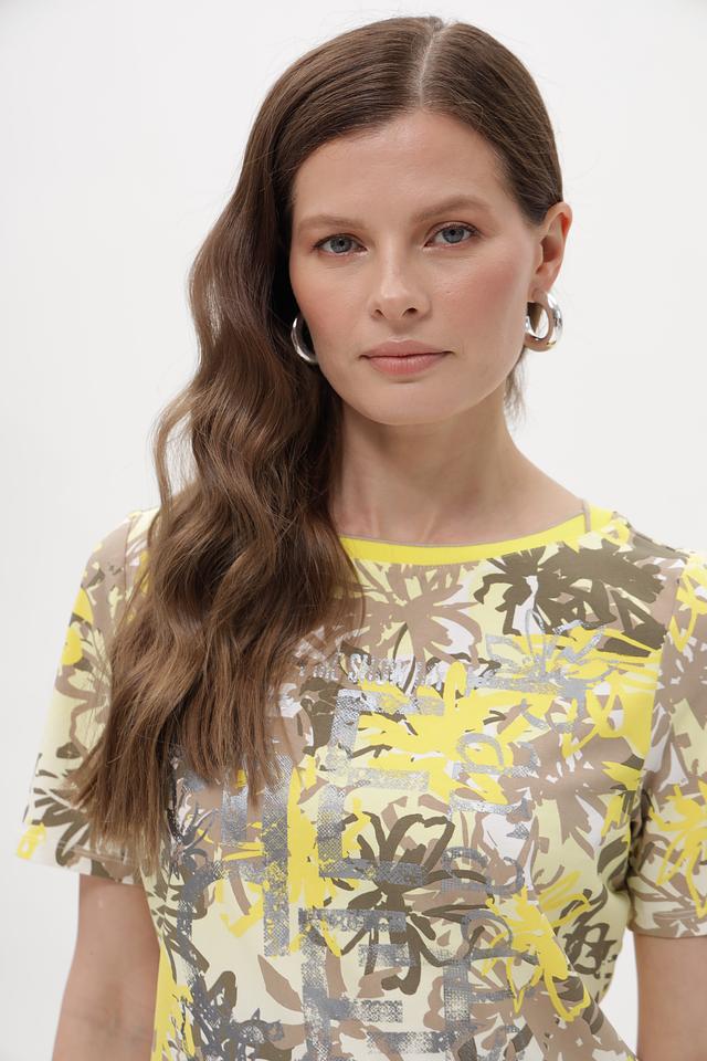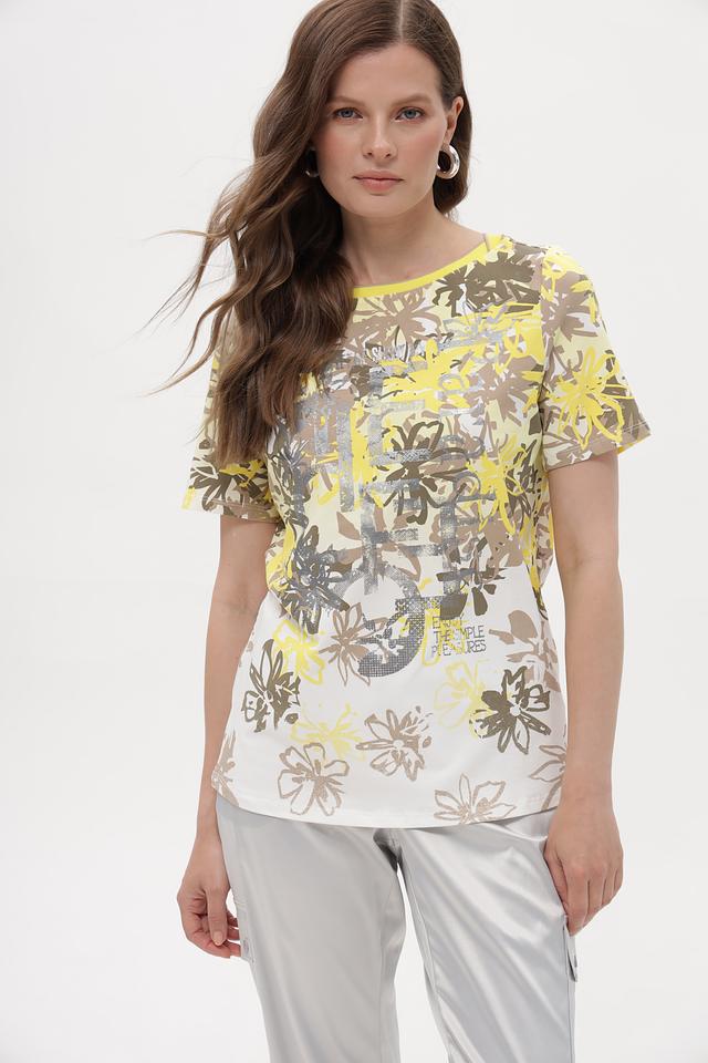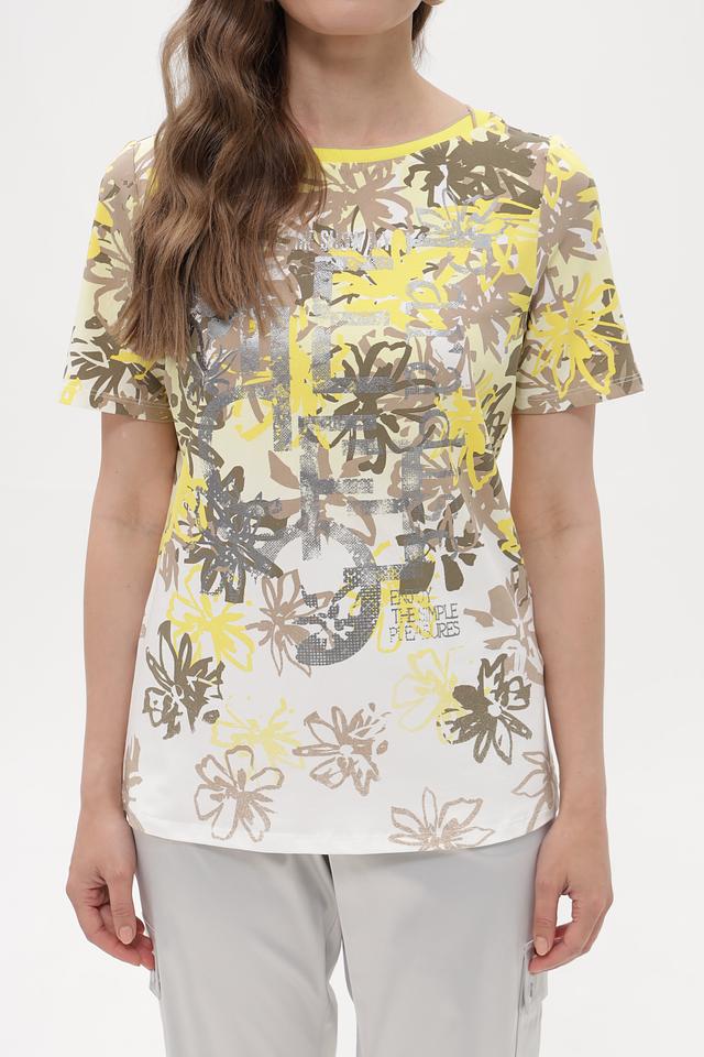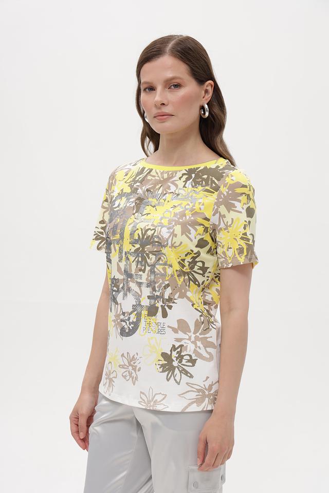 Женская футболка Barbara Lebek – это стильное и комфортное решение для повседневного образа. Футболка выполнена в оригинальном дизайне с ярким цветочным принтом, сочетающим в себе оттенки бежевого, жёлтого, серого и белого.