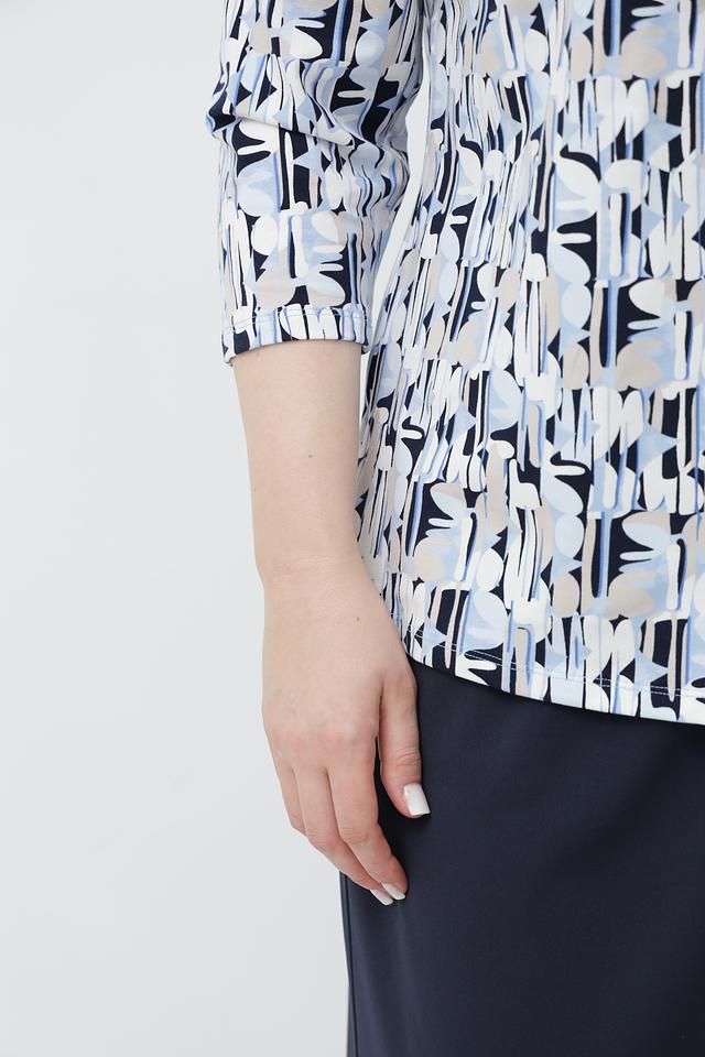Женская блузка от бренда Lebek станет отличным дополнением к вашему гардеробу. Модель выполнена в светло-голубой цветовой гамме и украшена стильным геометрическим принтом в сочетании белого и синего цветов.