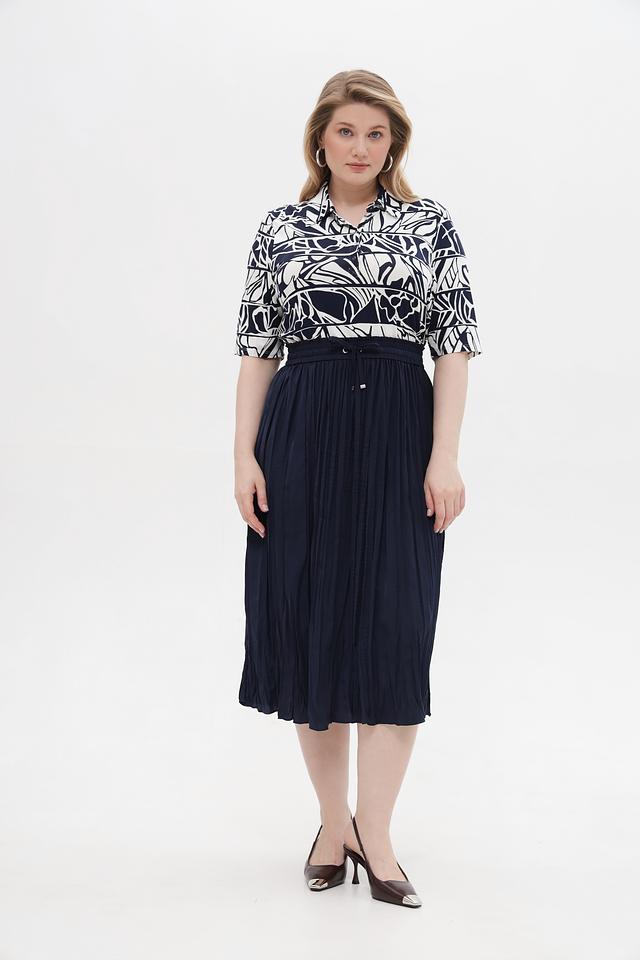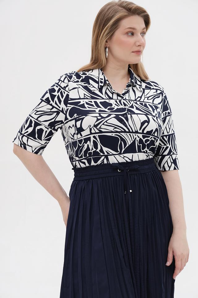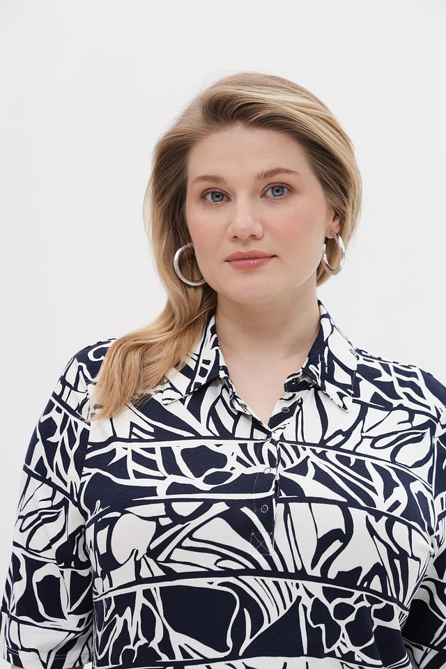 Футболка имеет прямой крой и короткий рукав, что делает ее универсальной для различных образов. Воротник-стойка добавляет изысканности, а яркий сине-белый принт придает индивидуальность.