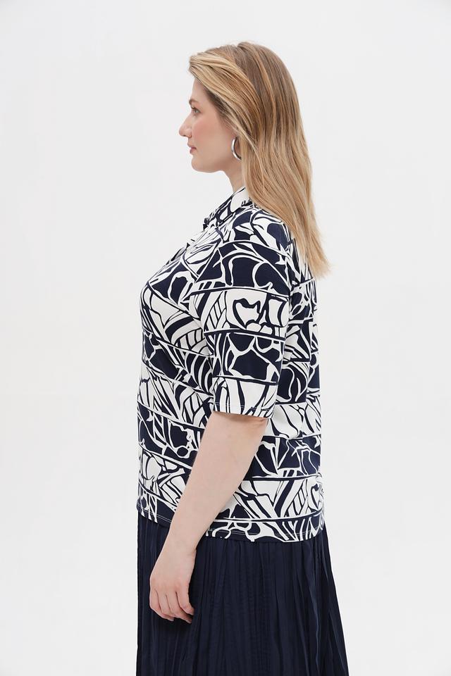 Женская футболка Barbara Lebek белого цвета с оригинальным сине-белым принтом. Модель с коротким рукавом и воротником-стойкой, выполнена из мягкой вискозы с добавлением эластана для комфорта. Состав: вискоза 95%, эластан 5%