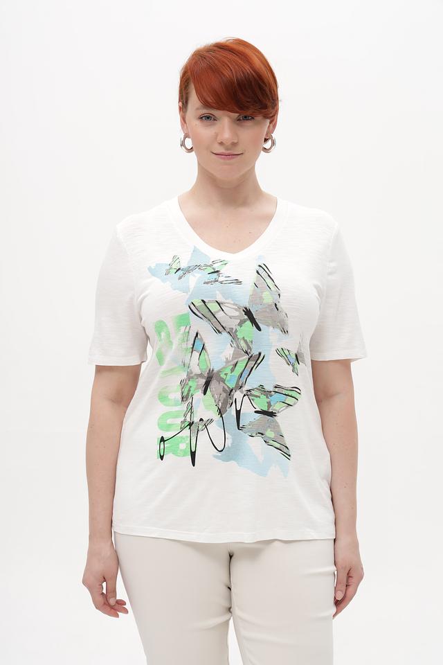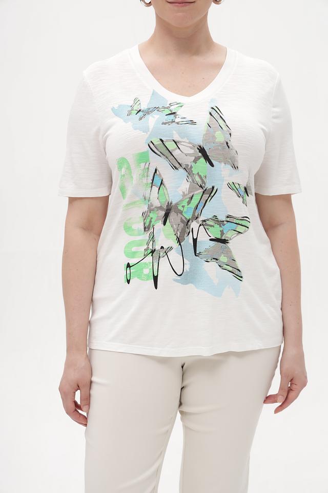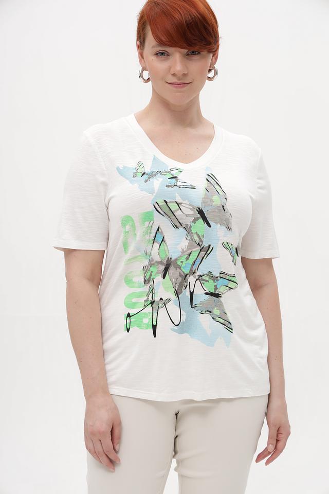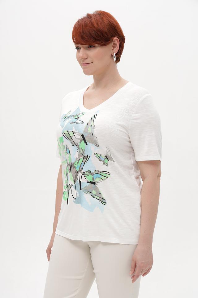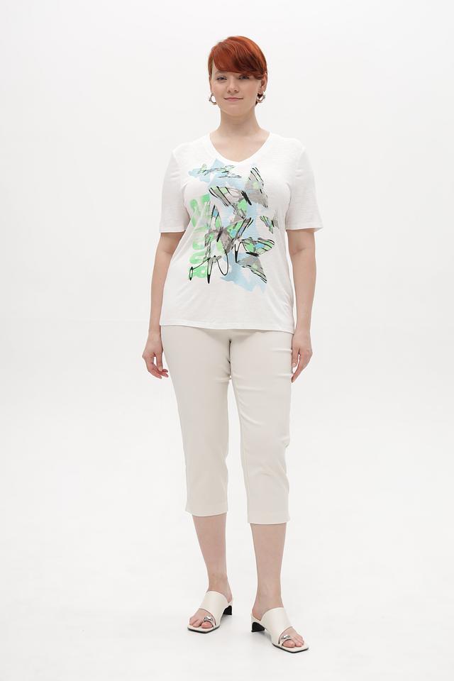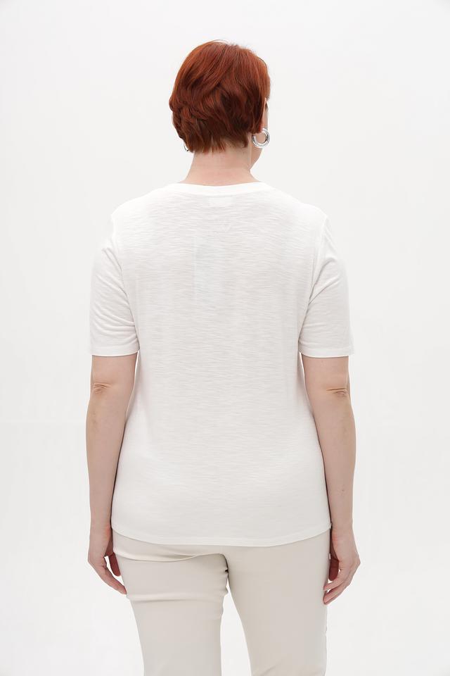 Состав ткани: 95% вискоза, 5% эластан. Эта комбинация обеспечивает комфорт в носке и сохранение формы изделия после стирки. Футболка идеально сочетается с джинсами, брюками или юбками, создавая непринужденный и стильный образ.