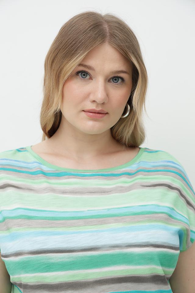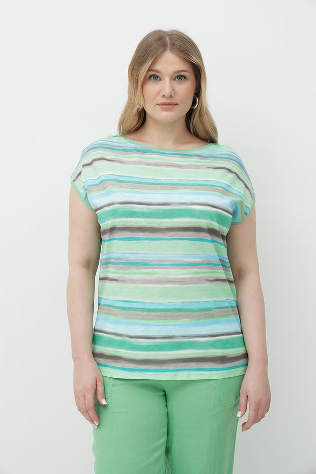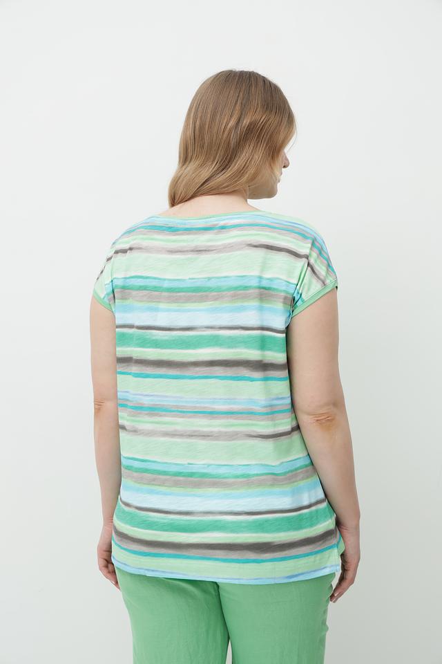 Футболка имеет свободный крой, который не сковывает движений и позволяет создать расслабленный образ. Яркий полосатый принт в зеленых и коричневых тонах делает эту модель особенно привлекательной и стильной.