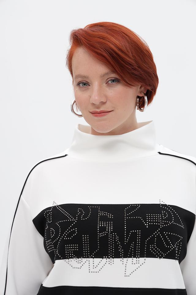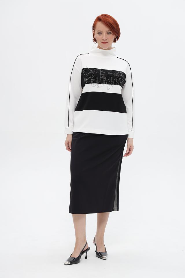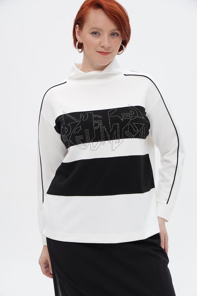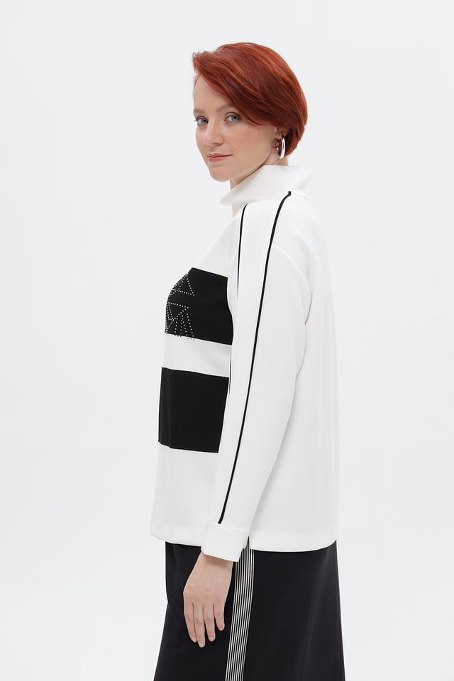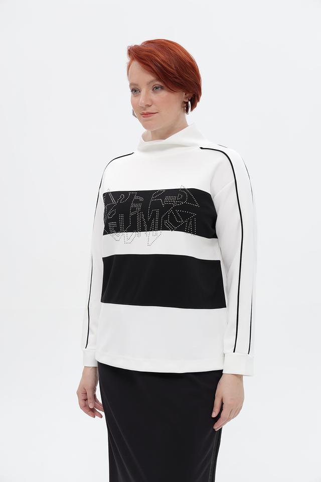 Стильный пуловер от бренда Lebek станет ярким акцентом вашего образа. Модель выполнена в белом цвете с черными вставками и эффектным декором из страз.