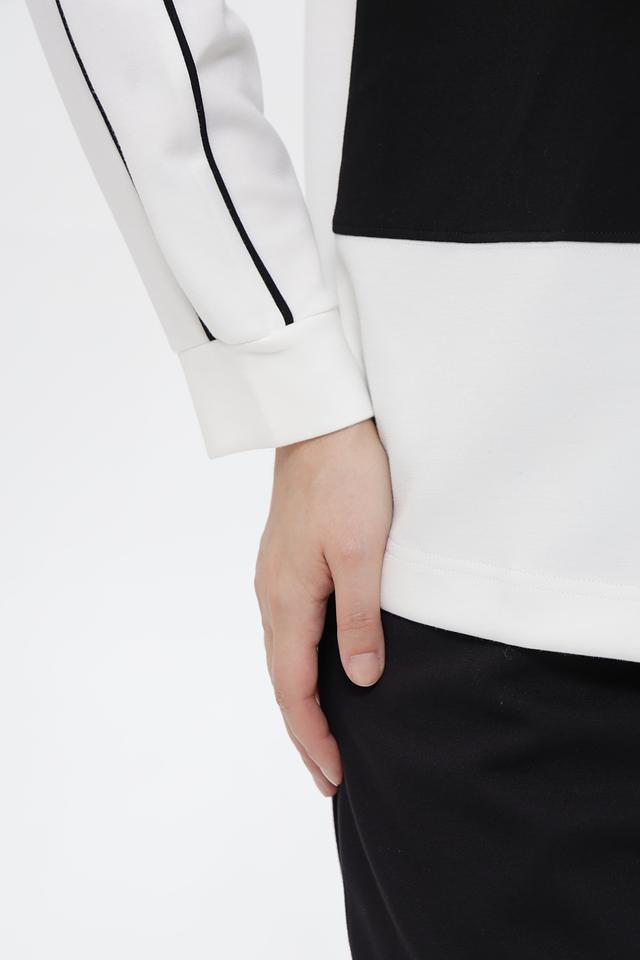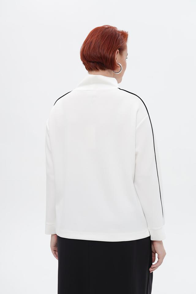 Пуловер имеет прямой крой, высокий воротник и длинные рукава с контрастными черными полосами по бокам. Благодаря составу ткани — 50% полиэстер, 45% вискоза и 5% эластан — изделие приятно к телу, хорошо держит форму и не сковывает движений.