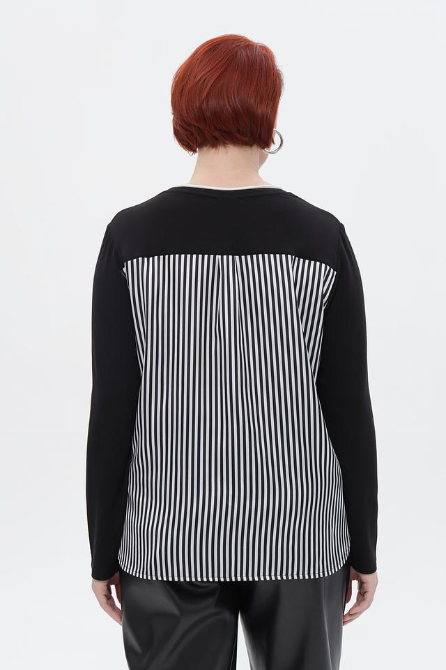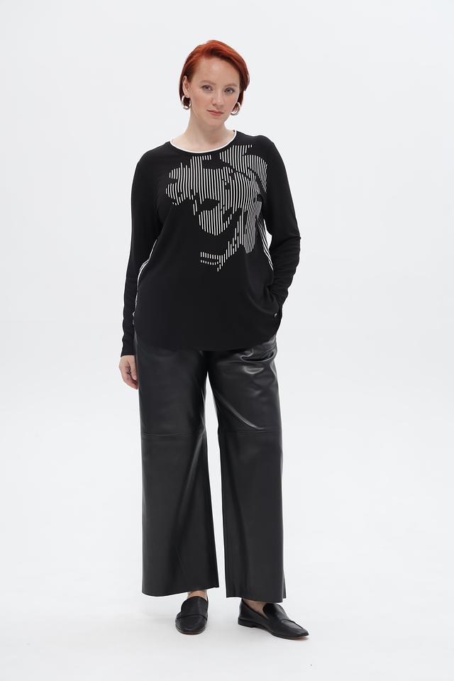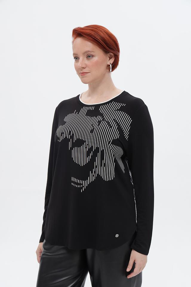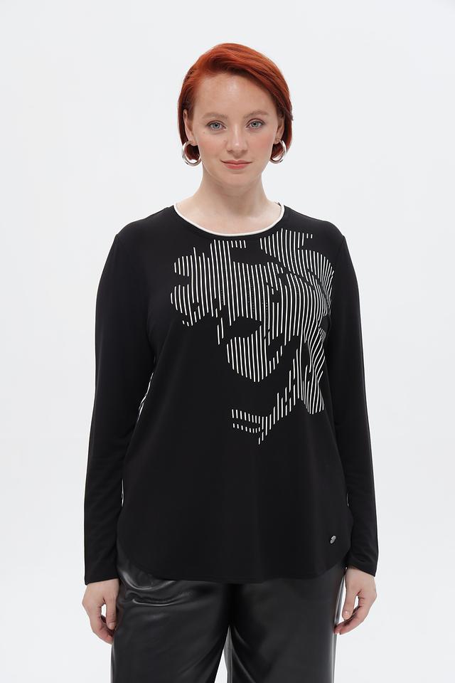 Женская футболка от бренда Lebek выполнена в чёрном цвете с эффектным принтом в виде лица, состоящего из белых вертикальных полос. Модель имеет круглый вырез горловины и длинные рукава, что делает её подходящей для прохладной погоды.